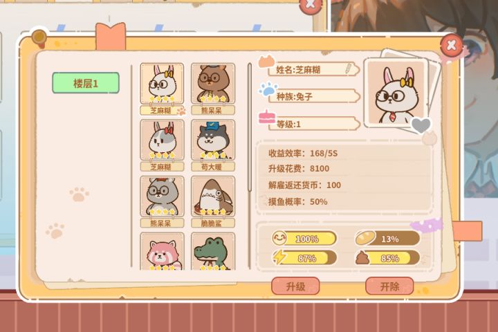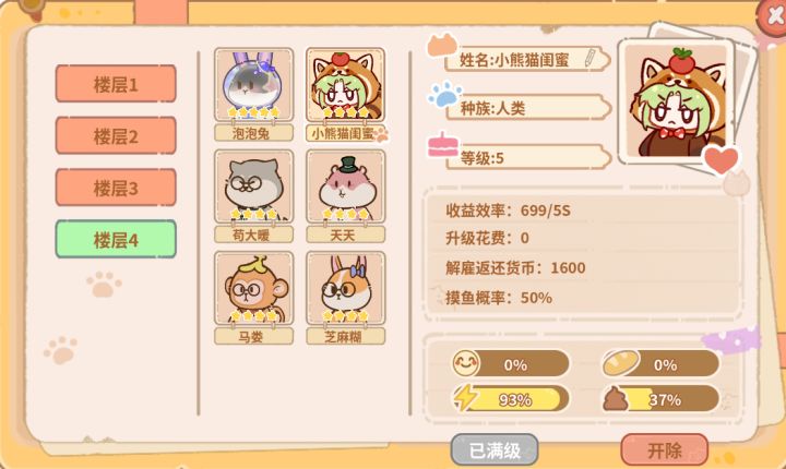 这时候日子还是过得紧巴巴的,是什么时候开始才迎来转机呢,那就是第一次扩建之后。我开始注重设施的品级,反正横竖都是挂机赚钱,我索性多挂一会,直接造品质高一些的设施。不得不说,品质上来了,效率也提高了。而且小动物的等级是与办公桌等级挂钩的,设施的恢复量也与设施等级挂钩。