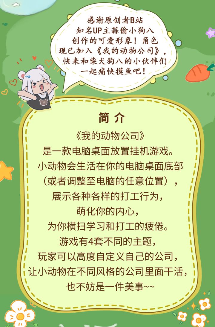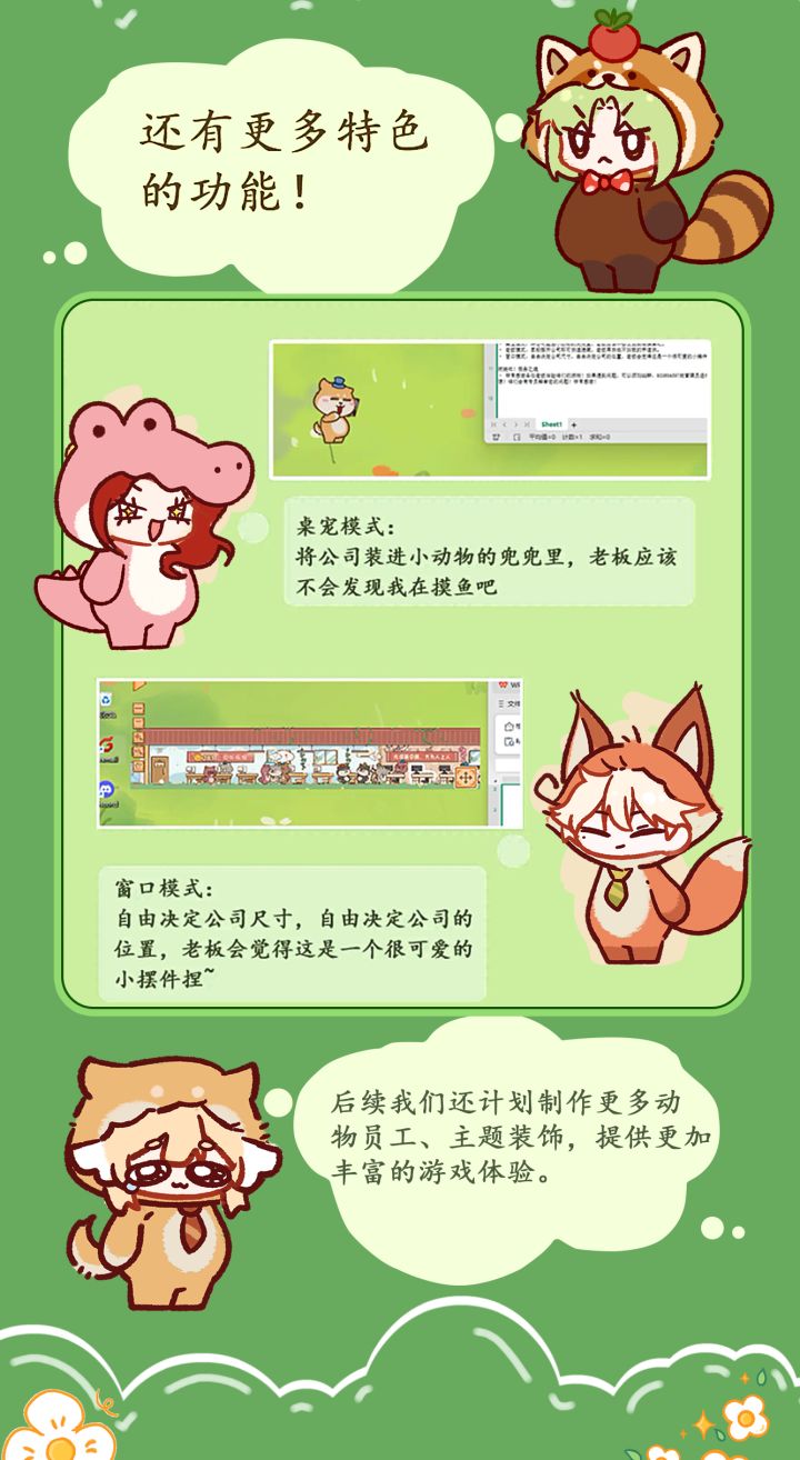 还请大家点个关注,多多三连,你的支持是我更新的最大动力! 游戏名:我的动物公司 平台:Steam 售价:免费试玩demo 简介:一款真正的摸鱼圣品!治愈每个因上班而痛苦的人! 它将出现在你屏幕下方,是一款放置类休闲游戏,你只需要通过点击和拖拽就能轻松游玩,当然,你也可以什么都不做,它依然会自行运转。游戏中,你需要招聘这些可爱动物来你所创办的公司中上班,而你要做的就是当好这个老板,监督它们不要摸鱼。