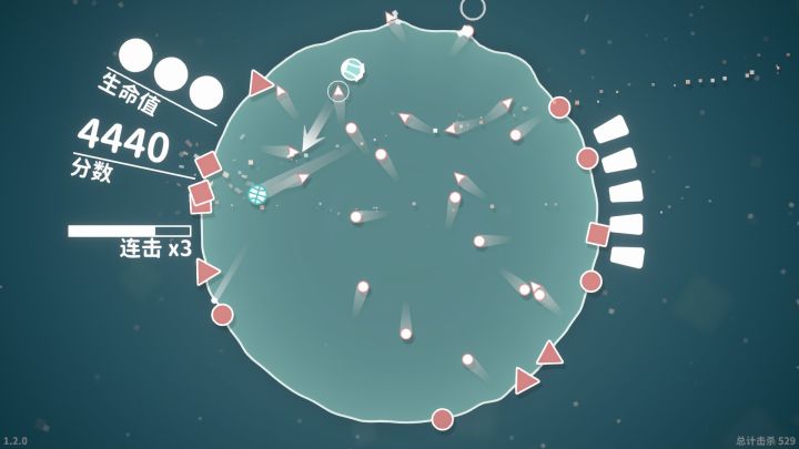 除了最简单的发射直线飞弹的敌人,还有能够发射轻微追踪弹、延时爆炸弹等弹幕的敌人,这些敌人和弹幕以各种简单的几何图形表示,也很好区分。