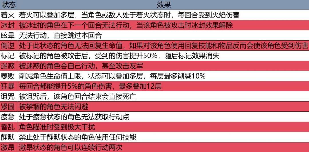 增益/减益BUFF说明 本作拥有多种状态效果,详细效果如下图表格所示: 除了对应效果,还有不同种类的增益与减益,效果如下图所示: