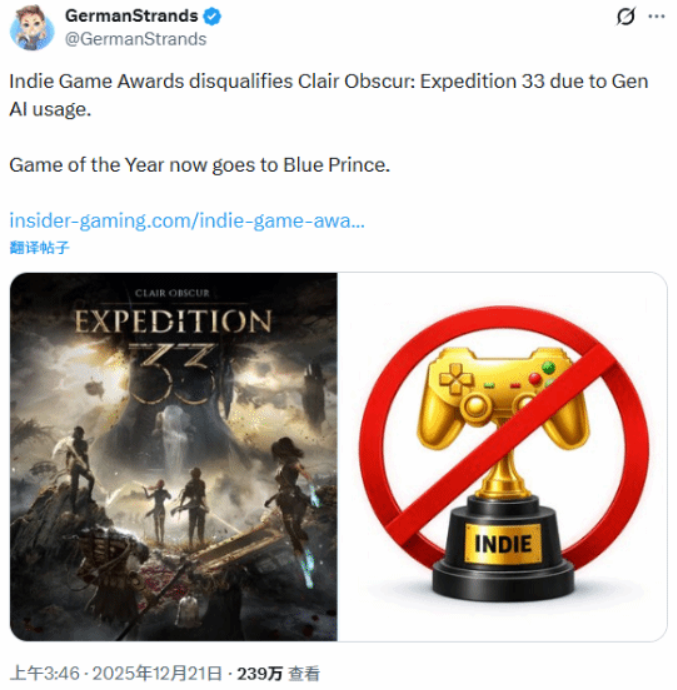 因为使用AI,独立游戏奖撤销《光与影》奖项