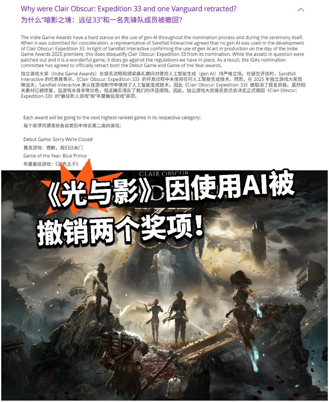 斩获独立游戏大奖(Indie Game Awards)年度游戏与最佳首秀游戏奖项的《光与影:33号远征队》,未能让开发商Sandfall Interactive与发行商开普勒互动团队庆祝太久。11月21日,独立游戏大奖组委会因该作发售版本包含生成式AI素材(虽已紧急修补移除)宣布撤销其荣誉。独立游戏大奖组委会在官网FAQ中声明:"Sandfall Interactive代表申报奖项时承诺未在开发