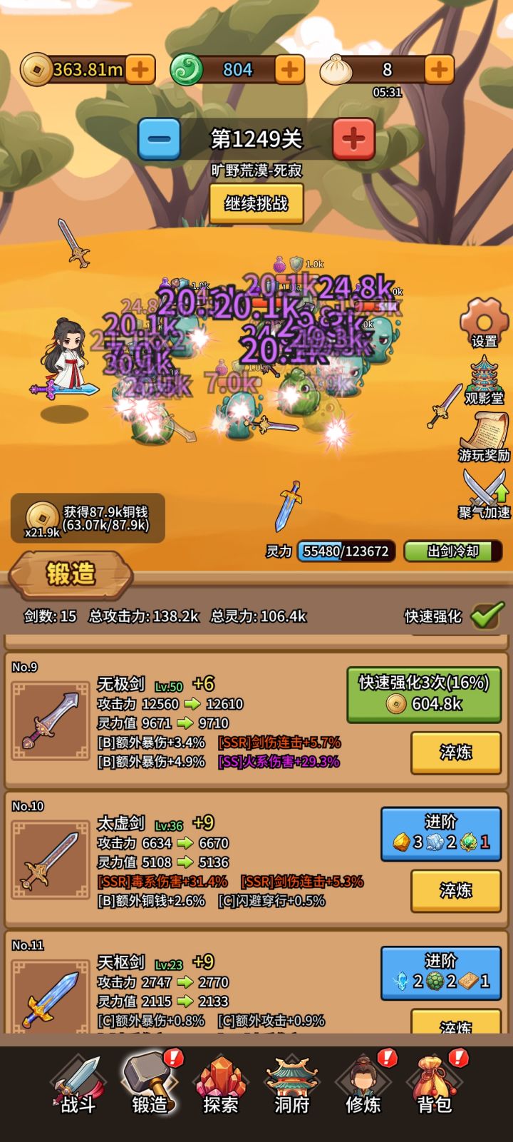 每次攻击会损耗灵力,灵力空了就闯关失败,扣除的灵力不会因为暴击连击或者额外伤害增加。闪避穿行不会扣除,但是总概率没法达到百分之百,所以没啥用,除非后期版本更新能点满。萌新第一条最有用的词条是额外攻击,额外攻击哪怕是基础比较低的SSS级也有100%的伤害加成,换算成灵力消耗减少有50%了。SSS词条概率和武器等级是正比关系,等级越高出现的概率越大,所以不要前期把石头全部洗完,卡关了再洗另一条出