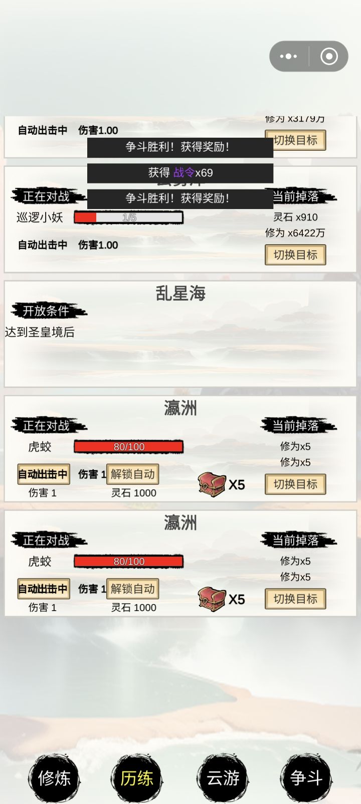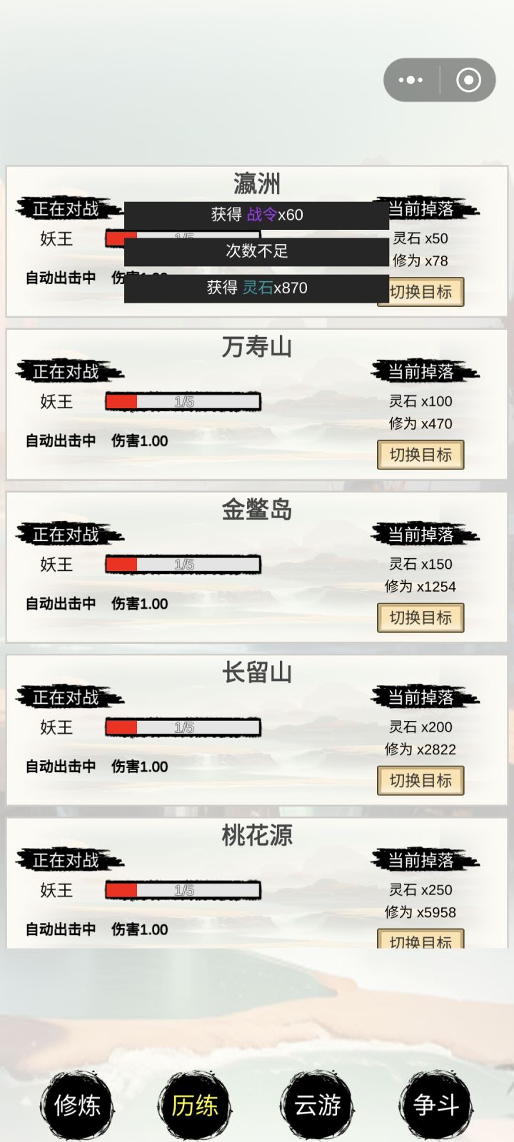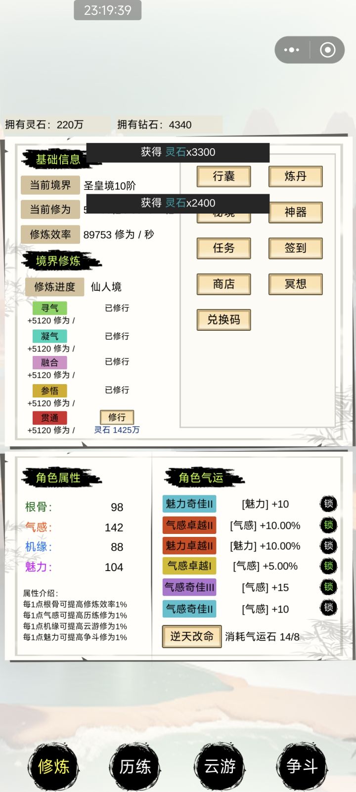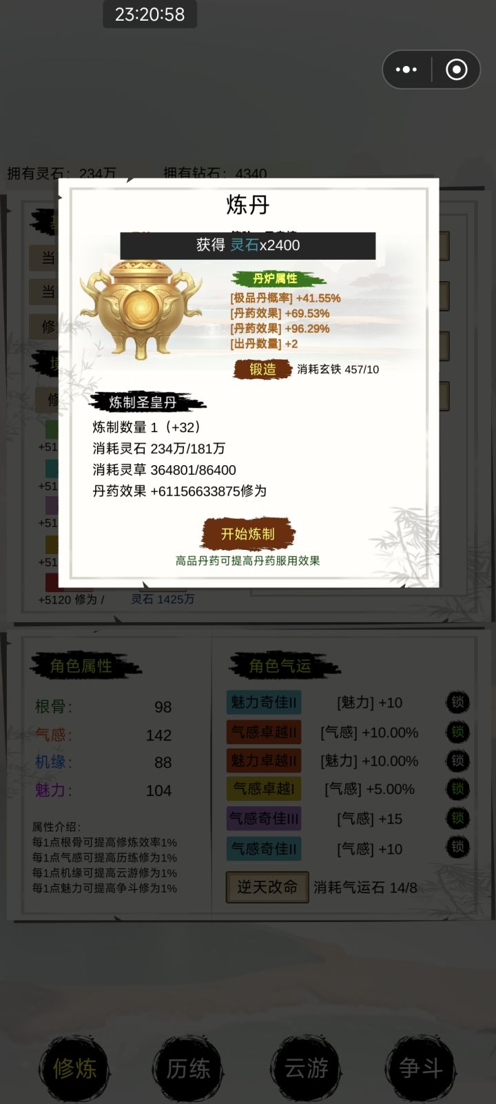 前期还走了弯路(点历练和斗争没有注重炼丹)后期改炼丹飞速升级,炼丹直接就是速成玩法