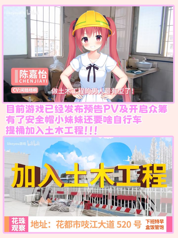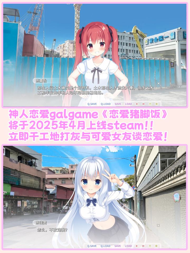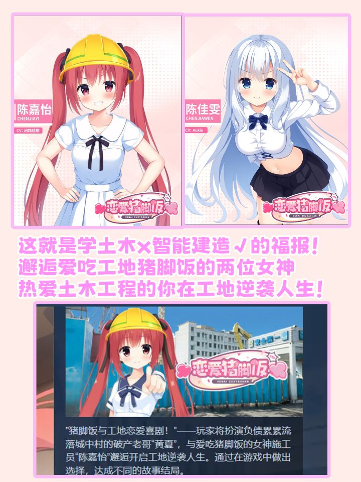 土木,哦不是现在应该叫智能建造专业的老哥实在是太有食粒啦,能够绑架计算机系老哥制作出这样一款奇妙的恋爱galgame~由b站土木老哥真实故事改编、励志工地逆袭、拥有多种结局路线、双女主的《恋爱猪脚饭》,pv曾表示将于2025年4月上线steam平台!就是本月,希望不要跳票。游戏pv一经发布就收获了诸多网友的吃瓜围观。网友们纷纷吐槽这是智能建造专业提桶跑路前的最终幻想......女一号:带安全帽