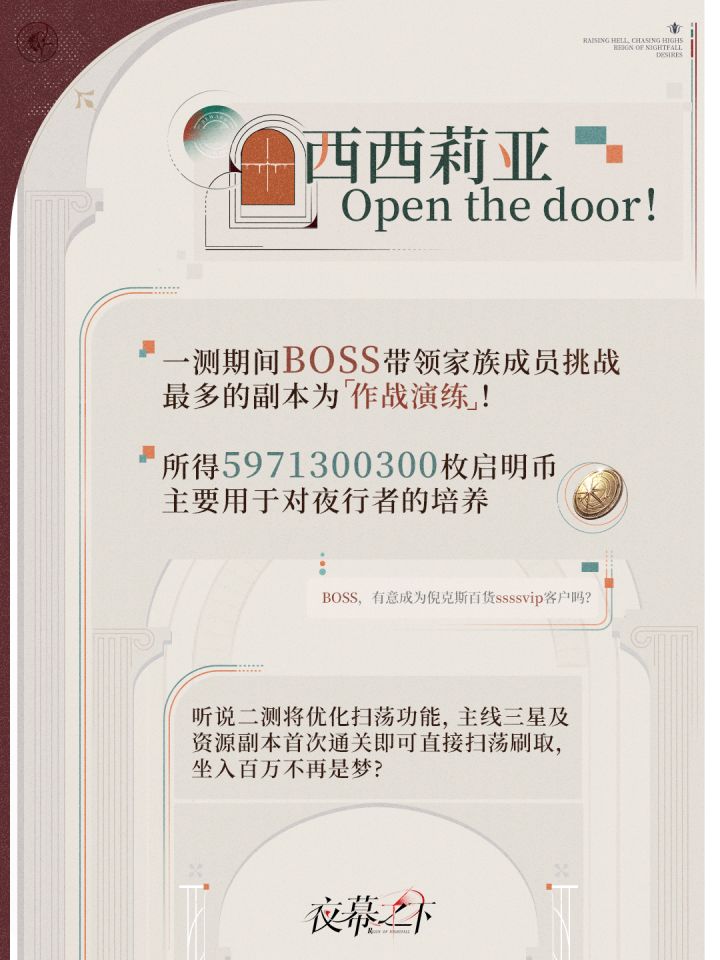 BOSS,二测招募在即,AA偶然间在报社翻出一份调查记录,似乎是一些上次测试中的神秘数据?上次测试中有多少启明币被消耗,有多少礼物送到夜行者的手中,又有多少纸飞机被用于传递短笺……除了改动较大的剧情和战斗外,即将到来的二测又有哪些跟上次不一样的小功能呢?►戳图片抢先查看部分优化内容情报►点击【关注】订阅报社,AA本周将为大家带来更多二测相关情报!#代号砰砰 #夜幕之下游戏#女性向游戏