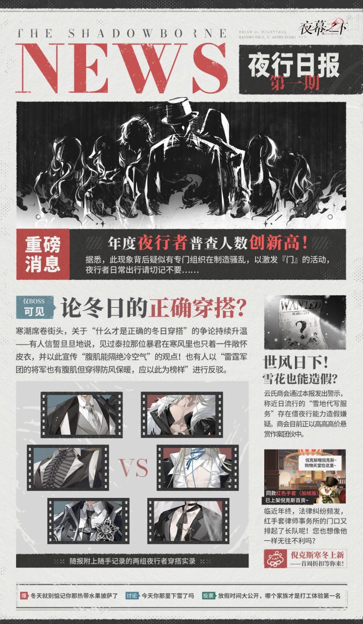 夜行报社本职工作属性大爆发!让您足不出户,掌握夜行世界的最新动态~夜行者近期话题、家族最新动向、不知何人投稿的小道消息一网打尽!看过的夜行者都说🤌(?————📝附上AA投递报纸时的便条:天气冷冷的,AA怀里刚掏出来的《夜行日报》热热的,刚好给BOSS暖暖手!说起来,BOSS觉得在这样的冬日里,哪位夜行者的穿搭风格才是最夯的?来评论区分享讨论一下吧~——————————🔮游戏预约:#代