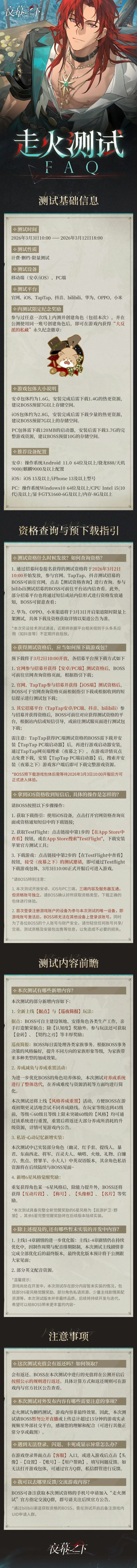 「走火测试」即将开启,测试资格将于3月2日10:00发放,预下载将同步开放,资格查询与游戏包体预下载相关说明BOSS可查阅图内详情「走火测试」将于3月3日10:00正式开启,游戏当前仍在开发中,测试内容并非最终效果。我们期待着BOSS体验后的反馈和建议,也会不断优化打磨游戏内容,争取后续版本中,为大家带来更好更丰富的游戏体验!*本次测试基础信息、内容前瞻与注意事项等更多详情,BO