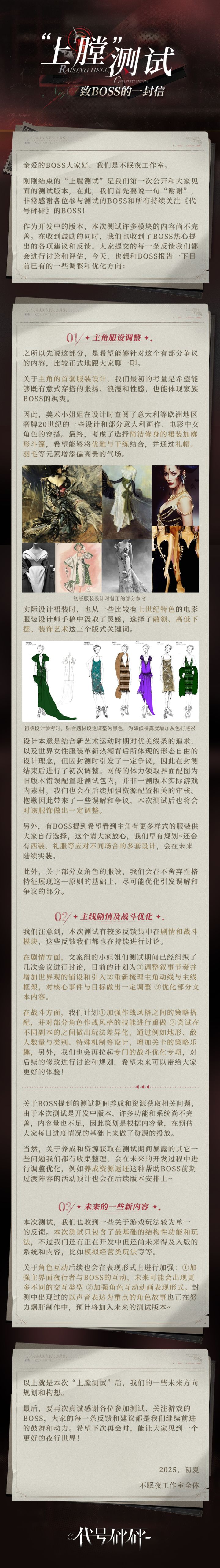 大家好,这里是不眠夜工作室。《代号砰砰》“上膛测试”现已结束,在此,我们首先要说一句“谢谢”,非常感谢各位参与测试的BOSS和所有持续关注《代号砰砰》的BOSS!作为开发中的版本,本次测试很多模块的内容尚不完善,大家的反馈我们都在认真整理和讨论中。今天,也想和BOSS报告一下目前已有的一些调整和优化方向~希望下次再会时,能让大家见到一个更好的夜行世界!详情请戳长图——————————⚜游