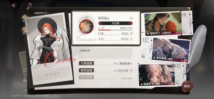 以上是战斗的极限,数据如图,甚至已经是手动操作的结果,命盘和技能红卡全部升到了5,黄卡差不多也有3先说先说福利,完全不够。真是搞不懂困难主线过完才有的五抽为什么这么难拿?我这是第1次见要拿完主线奖励还得过完困难模式的游戏,甚至只有五抽,还不能拿完新手池。新手池还要300才能自选,我玩的大部分二游只要充月卡,加上常驻资源和活动一天一抽是有的,保底也差不多140。第1次玩如此抠门的游戏,而且限定池后