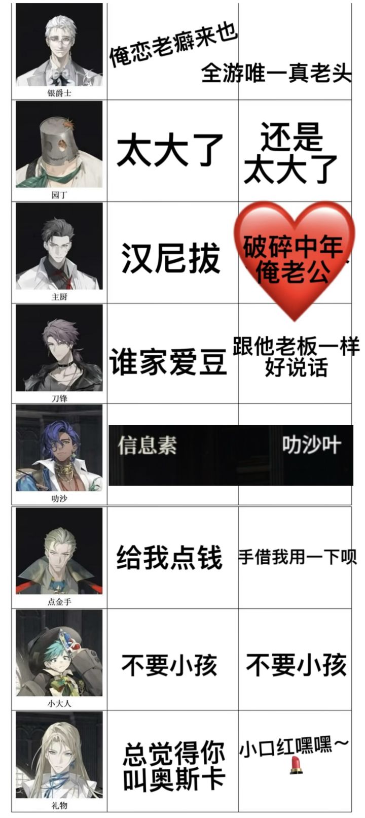 最喜欢将军喜欢喜欢喜欢!然后是野狼主厨红手套某某人。剧情不带脑子看挺好,激战后面想难死我吗材料本花一堆体力换仨瓜俩枣也是难受的很,抽卡爆率一般还容易歪,但我是颜控能怎么办呢希望公测能更好吧