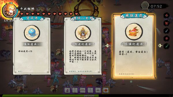 关卡内的武器法宝是本作做得最好的地方,在战斗中每升一级我们可以选择武器(法宝)或者永久buff以及一次性加成道具。武器(法宝)贴合了《西游记》的背景,有金箍棒、芭蕉扇、火眼金睛等耳熟能详的法宝,当然也有一些比较扯淡的武器比如弹幕攻击、3D画图画黑洞之类无厘头的武器,十分有趣就是攻击力太低了。
