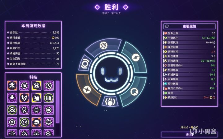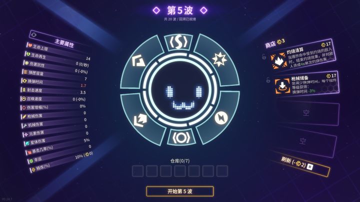 比如,假设你把武器全部换成有速度限制且会定期结束CD重新刷新的卫星,那在面对数量、刷新频率逐渐增加的敌人潮时,你会处于十分被动的局面,但假如你在之前刷出了卫星消失时爆炸与卫星消失时发射子弹这两个加成,那么在装备的卫星等级高、数量多的情况下,你完全可以卸掉主武器放手躺赢。