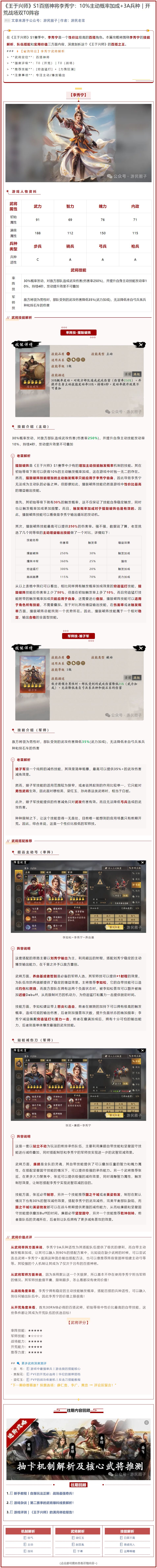 大家好,这里是柚子Lab,一个用数据说话的硬核游戏研究所。 前言: 随着S1赛季缓缓落下帷幕,我把这一赛季出现的所有武将的属性整理成了一份表格。王于相较其他slg,一个最大的不同就是人物不再仅局限于三国,而是从封神演义一直到明末清初的历史人物都有。这一方面也丰富了武将的可能性,不像其他游戏,后期知名人物出完了就只能出各种SP武将;但另一方面,在数值设计上,可能也会让众多熟悉了三国背景的玩家摸不着