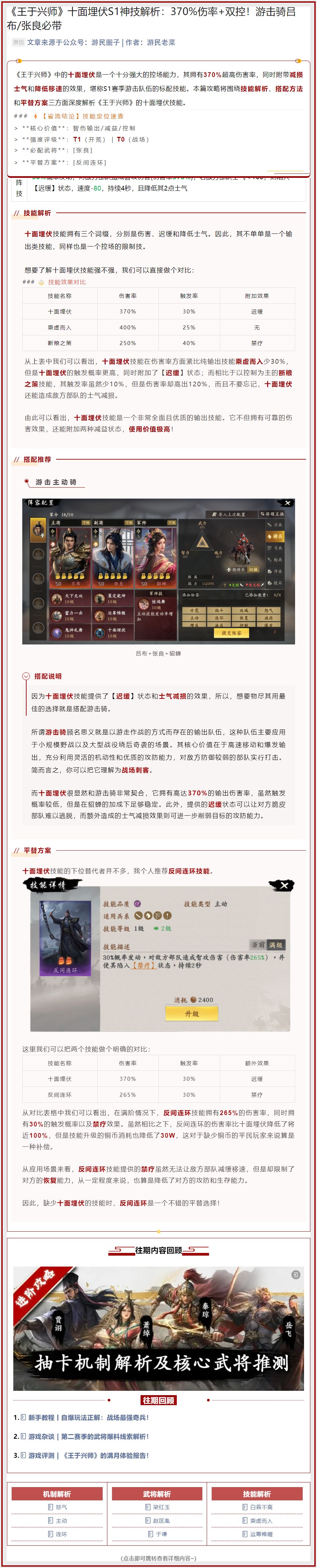《王于兴师》中的十面埋伏是一个十分强大的控场能力,其拥有370%超高伤害率,同时附带减损士气和降低移速的效果,堪称S1赛季游击队伍的标配技能。本篇攻略将围绕技能解析、搭配方法和平替方案三方面深度解析《王于兴师》的十面埋伏技能。 #王于兴师 #王于兴师攻略