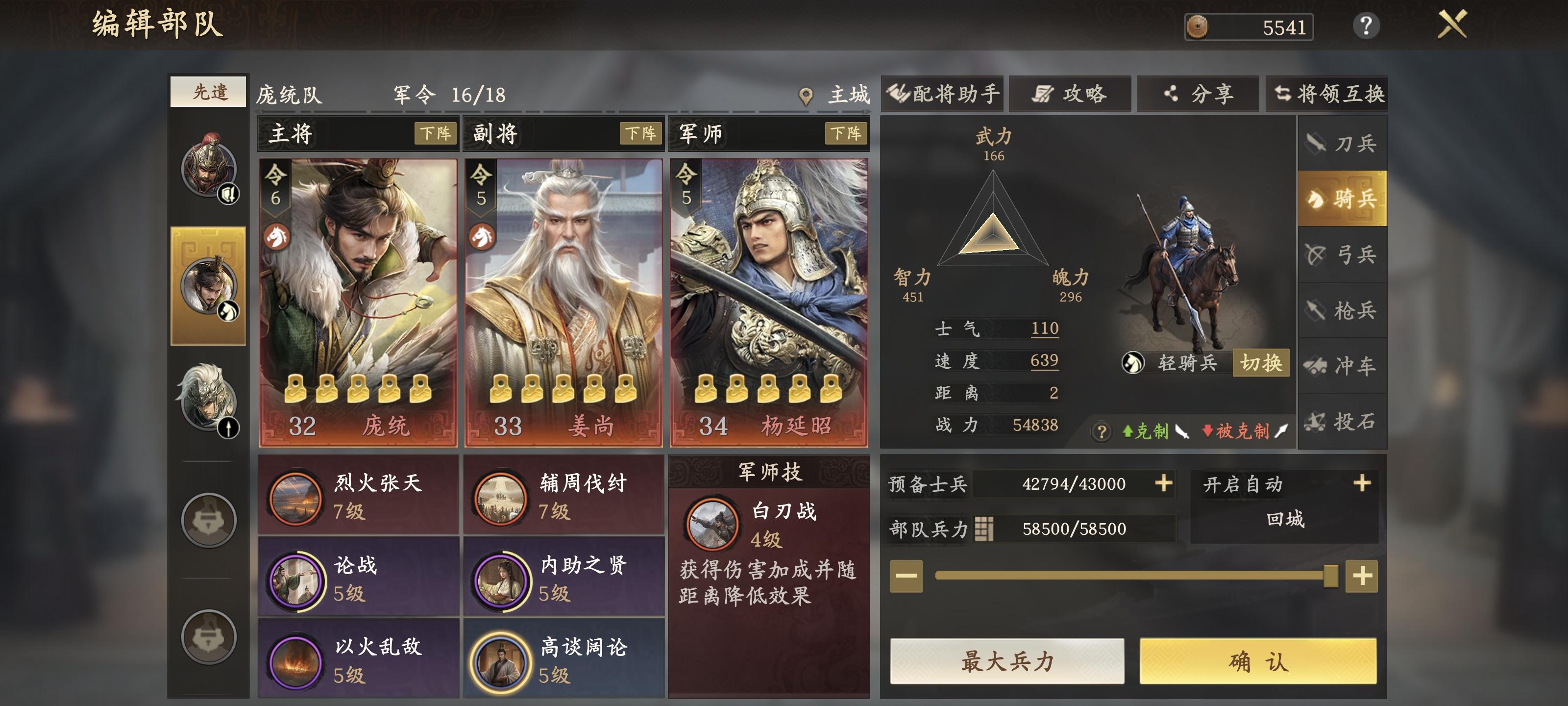 二、打架阵容推荐PVP需注重爆发输出、控制链和兵种克制,以下为热门流派:1. 霸王枪(T0级输出)核心武将:项羽(主C) + 虞姬(增伤辅助) + 刘基(暴击增益)兵种:蛇矛兵(克制骑兵)技能:项羽带【越战越勇】【鬼神乱舞】,虞姬点魄力属性提升抗性,刘基提供暴击率实战要点:项羽顶前排,虞姬辅助叠Buff,蛇矛兵侧翼切入2. 陆逊火攻队核心武将:陆逊(主C) + 张良(免嘲讽) + 貂蝉(发动