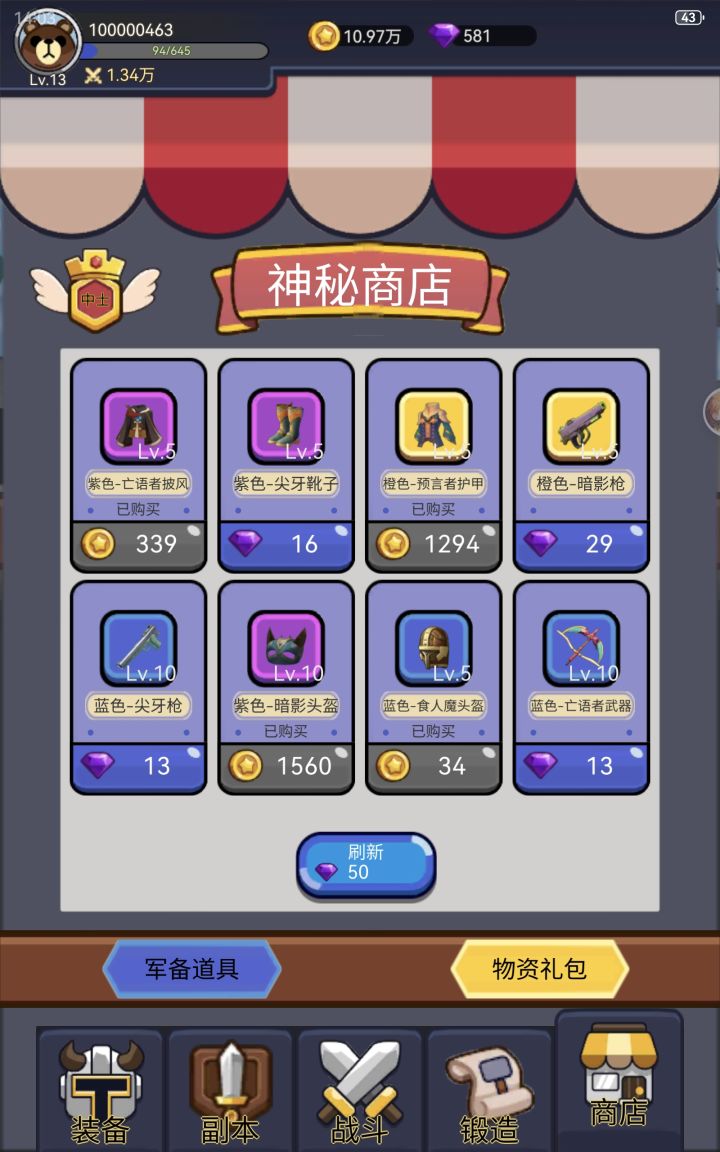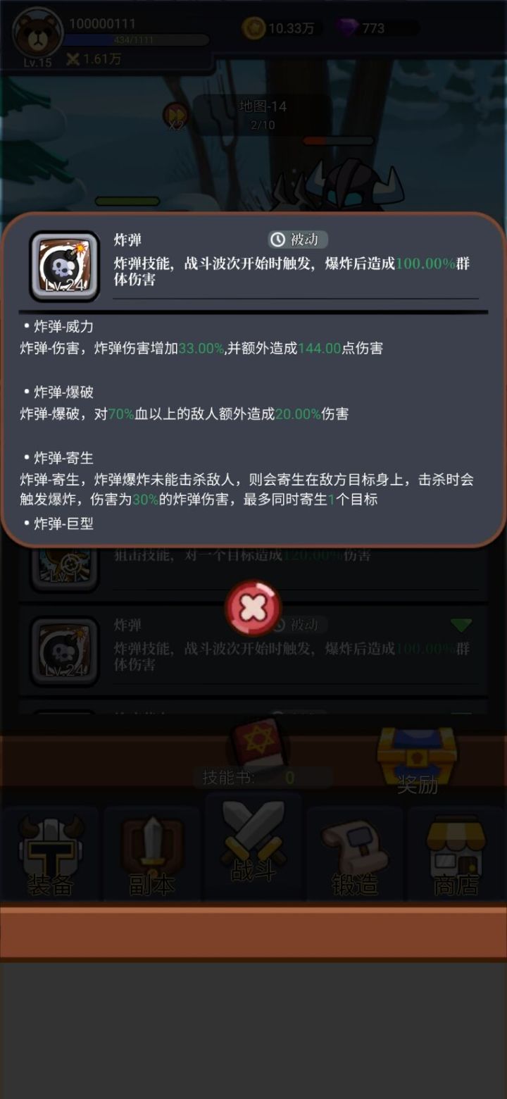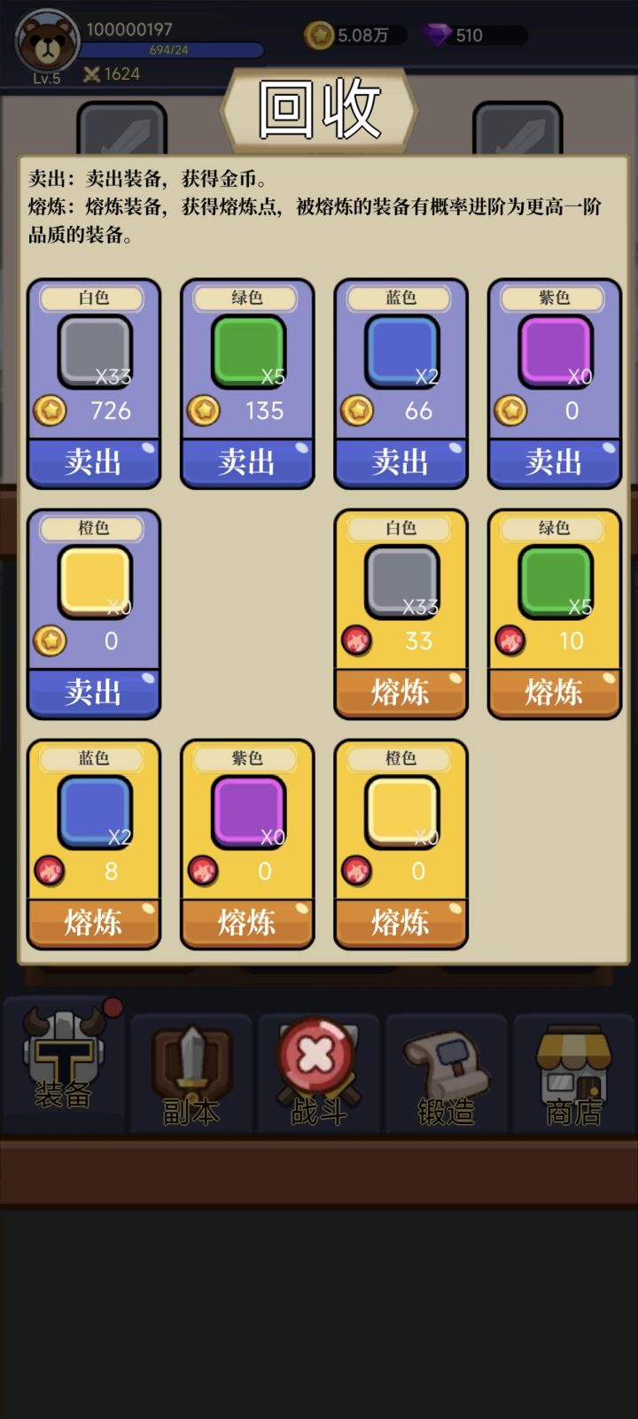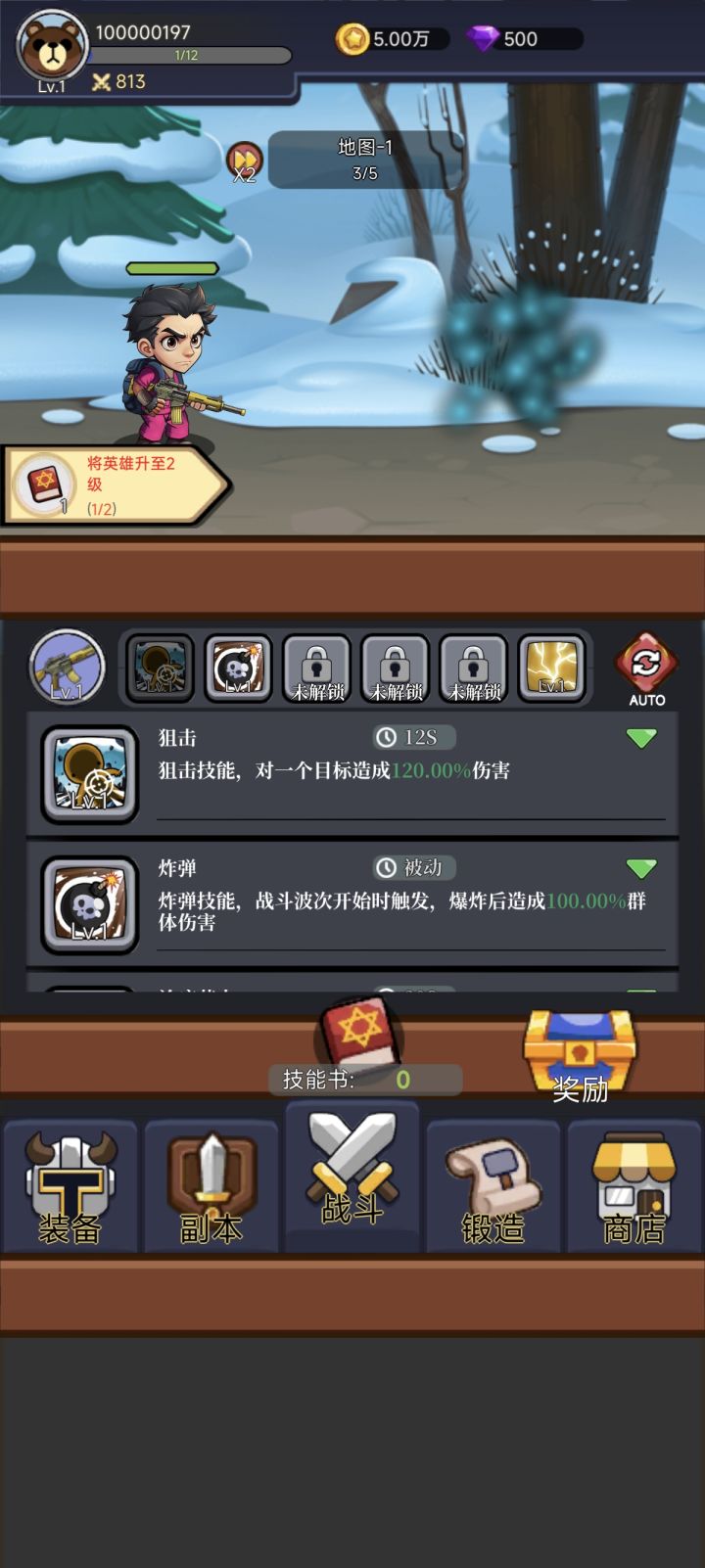 进游戏第一件事先开2倍速,在游戏中地图左边加速按钮,功勋达到少尉可以3倍速游戏任务完成会获得技能书,点击战斗上面的技能书会出现三选一技能选择,技能达到一定等级会质变,炸弹可以寄生,闪电可以麻痹,治疗药水会变狼人(已证实)据作者所说火球可以召唤炎魔,斩击可以吸血,狙击可以多发(均未实测)装备里有回收按钮,里面可以选择卖出装备和熔炼装备,熔炼会获得熔炼点和更好的装备,建议熔炼,熔炼点可以在锻造里