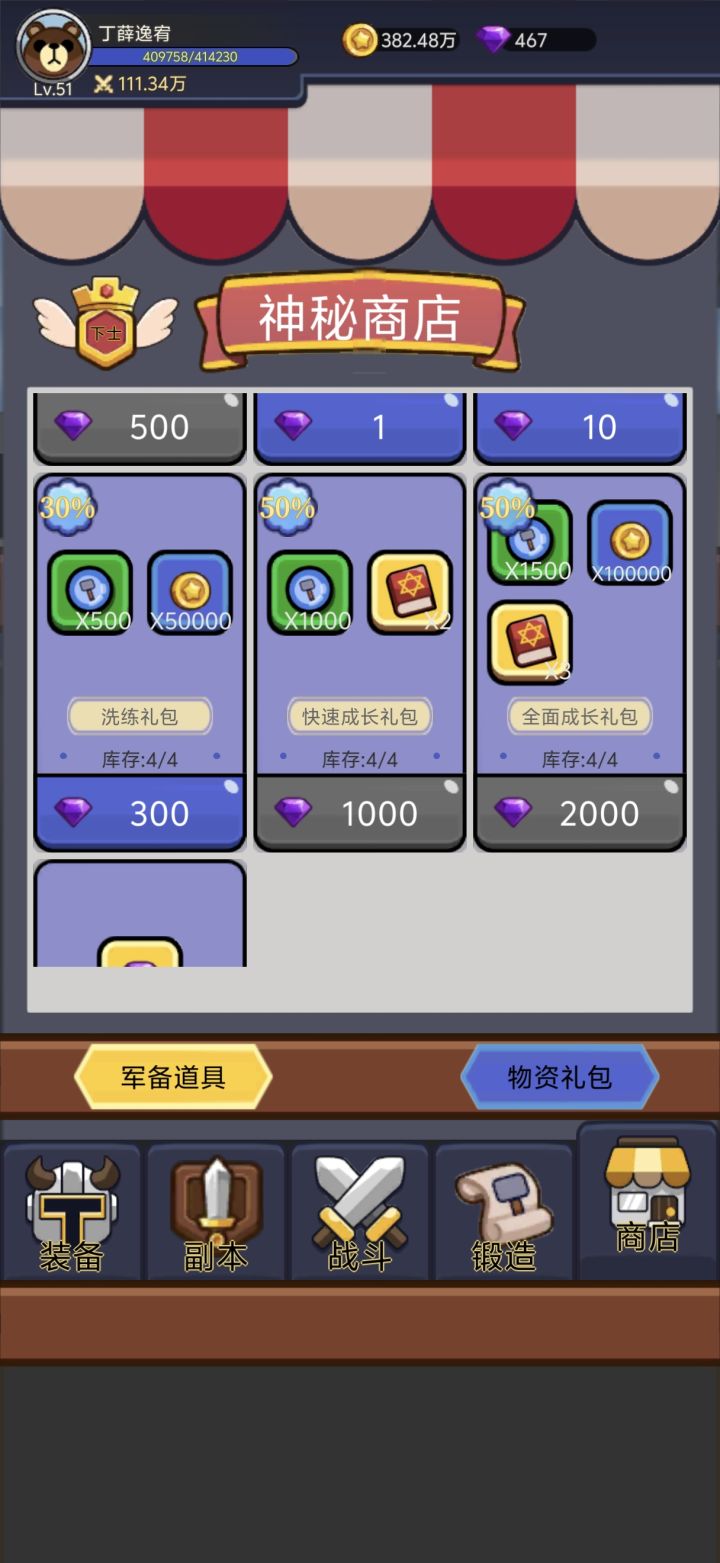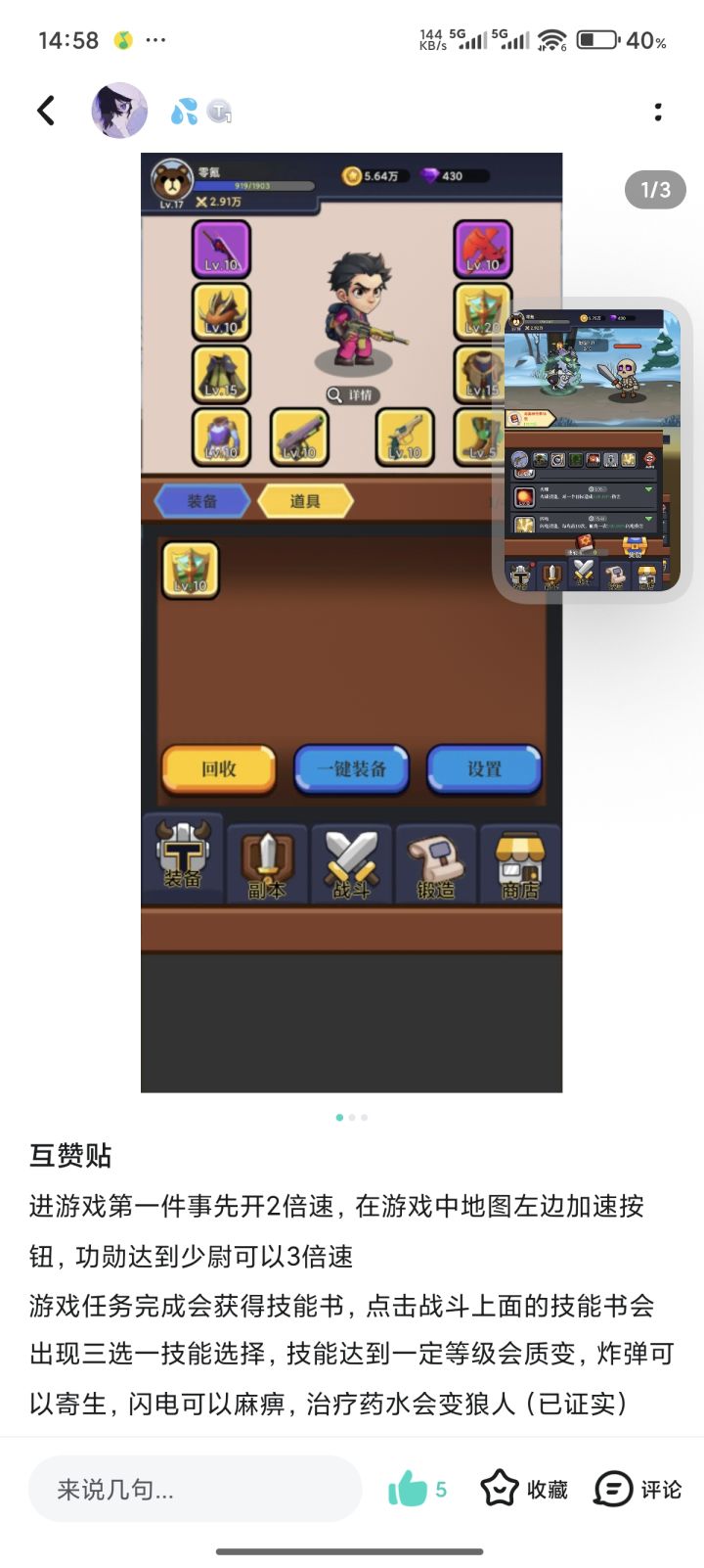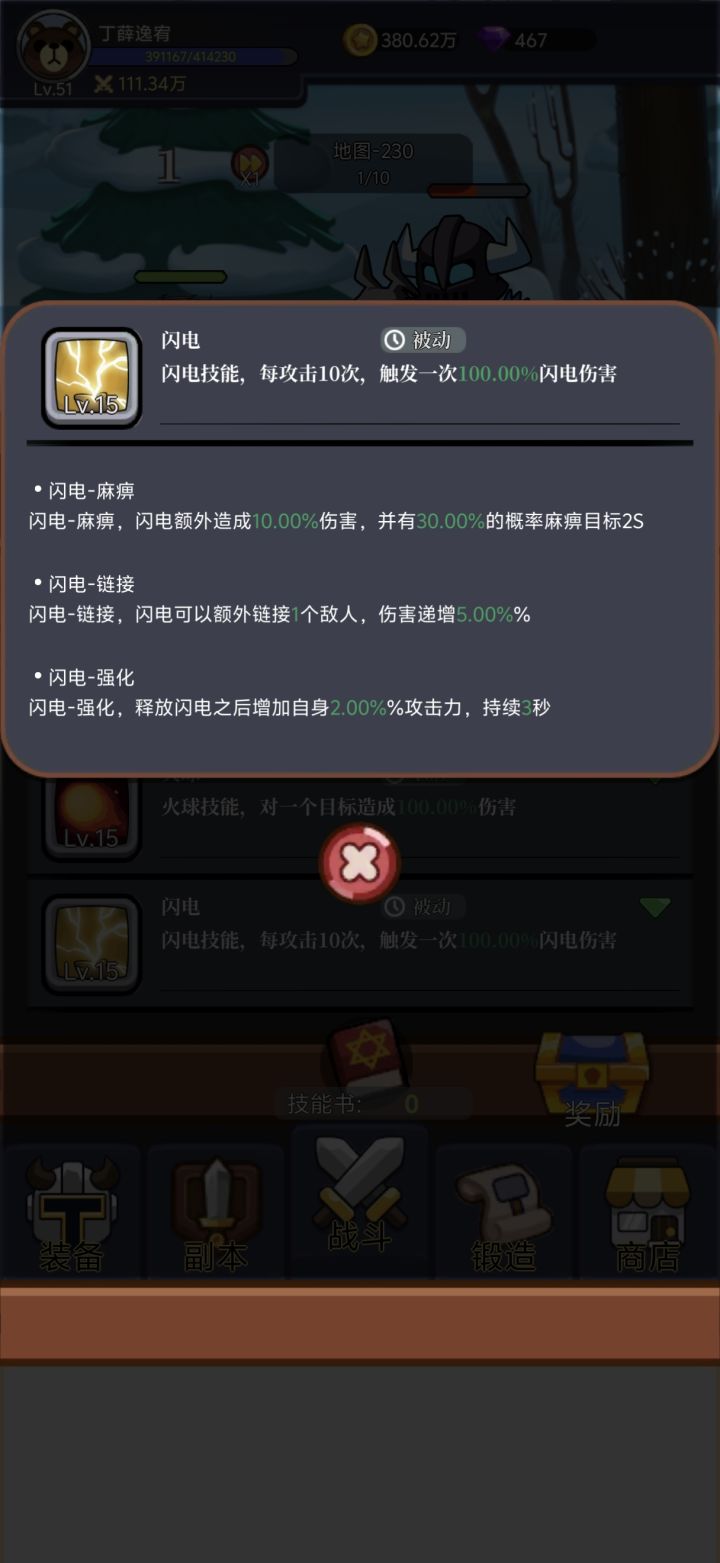 进游戏后点头像点官方一键加群,进群找福利小助手然后再过来写15字加图片的攻略。技能点优先点药水或斩击,先将一个点到15级再去补另一个,或者一直继,后面可以补雷电。前期卡关可以去商店用金币买装备,商店里面的物资礼包只买带技能书的。打不过去打副本,副本爆的没啥用,装备紫色以下全熔炼,别卖,目前最高熔炼100级。 这个游戏主要是装备跟技能,技能等级高所附带的属性就越多,过图能提高装备等级,后期熔炼的