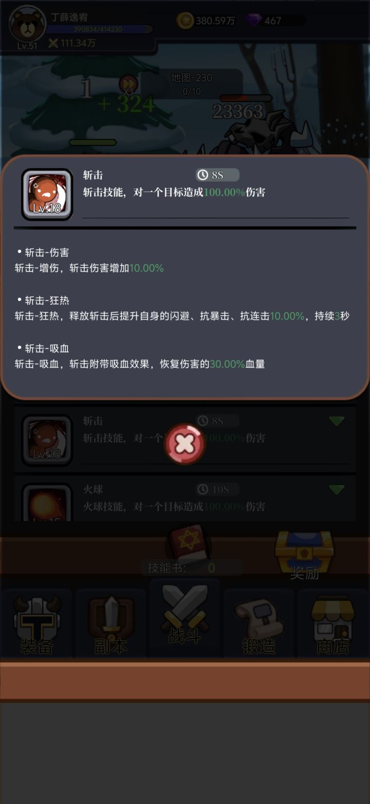 关于技能升级的优先级。目前主流的思路是推图。因为这游戏打楼层boss没有时间限制,所以只要不死就能过图。而过图又关联的挂机回报率和装备锻造,装备掉落的等级。所以提高生存过图是目前最主流的思路。 首先推荐的技能是治疗。这个技能不但能回血,10级之后还能变身狼人提高攻击伤害。等级再提升还会有其他附加增益属性。缺点就是CD有30秒,有点长啊。 第二个推荐的技能是斩击。这个技能是所有技能里面CD时间