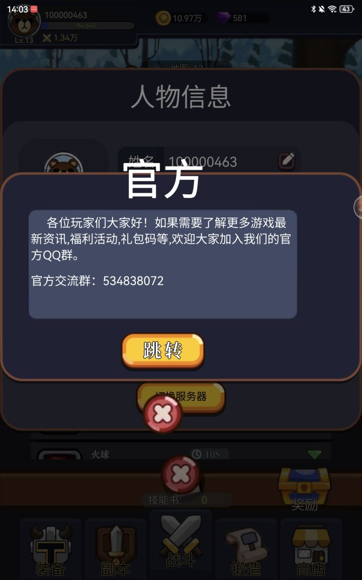 1.进游戏,点头像,点官方一键加群,进群找福利小助手,然后再过来写15字加图片的攻略。2.技能点,先点药水或斩击,先将一个点到15级再去补另一个,或者一直继续点。3.前期卡关可以去商店用金币买装备,商店里面的物资礼包只买1000的。再打不过我去打副本,副本失败不会减次数可以多试几次,7500战力可以稳过副本难度一。副本爆的三件紫装对前期还是很重要的。4.多的装备一定要熔炼,熔炼可以有几率爆出