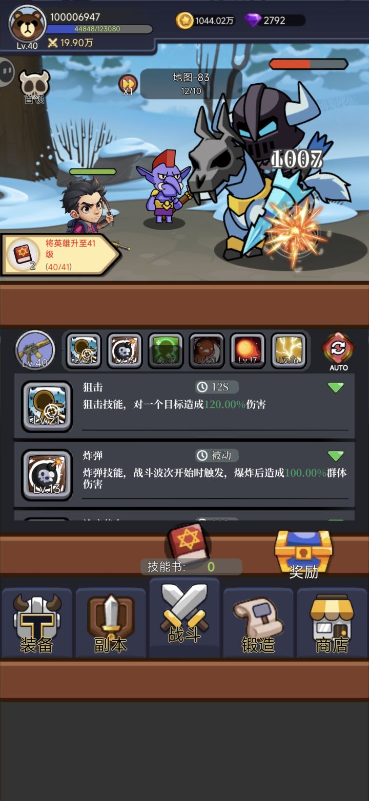 关于技能升级的优先级。目前主流的思路是推图。因为这游戏打楼层boss没有时间限制,所以只要不死就能过图。而过图又关联的挂机回报率和装备锻造,装备掉落的等级。所以提高生存过图是目前最主流的思路。 首先推荐的技能是治疗。这个技能不但能回血,10级之后还能变身狼人提高攻击伤害。等级再提升还会有其他附加增益属性。缺点就是CD有30秒,有点长啊。 第二个推荐的技能是斩击。这个技能是所有技能里面CD时间