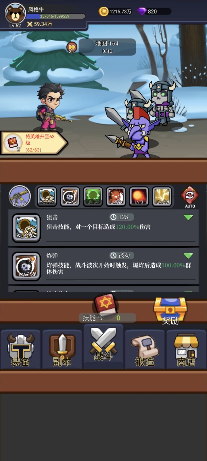 进游戏,先点头像加群拿福利。开启2倍加速,然后就是一直推图,搭配技能和装备,装备的等级是推图进度决定的,推的越高,掉落的装备等级越高。 装备直接点一键装备,不要的装备就熔炼掉,然后可以用熔炉打造(推图关数决定可以打造的等级)。 技能很关键,听从群里大佬的建议,治疗带着斩杀一起点,后面可以加上闪电。钻石千万别乱花优先买技能书