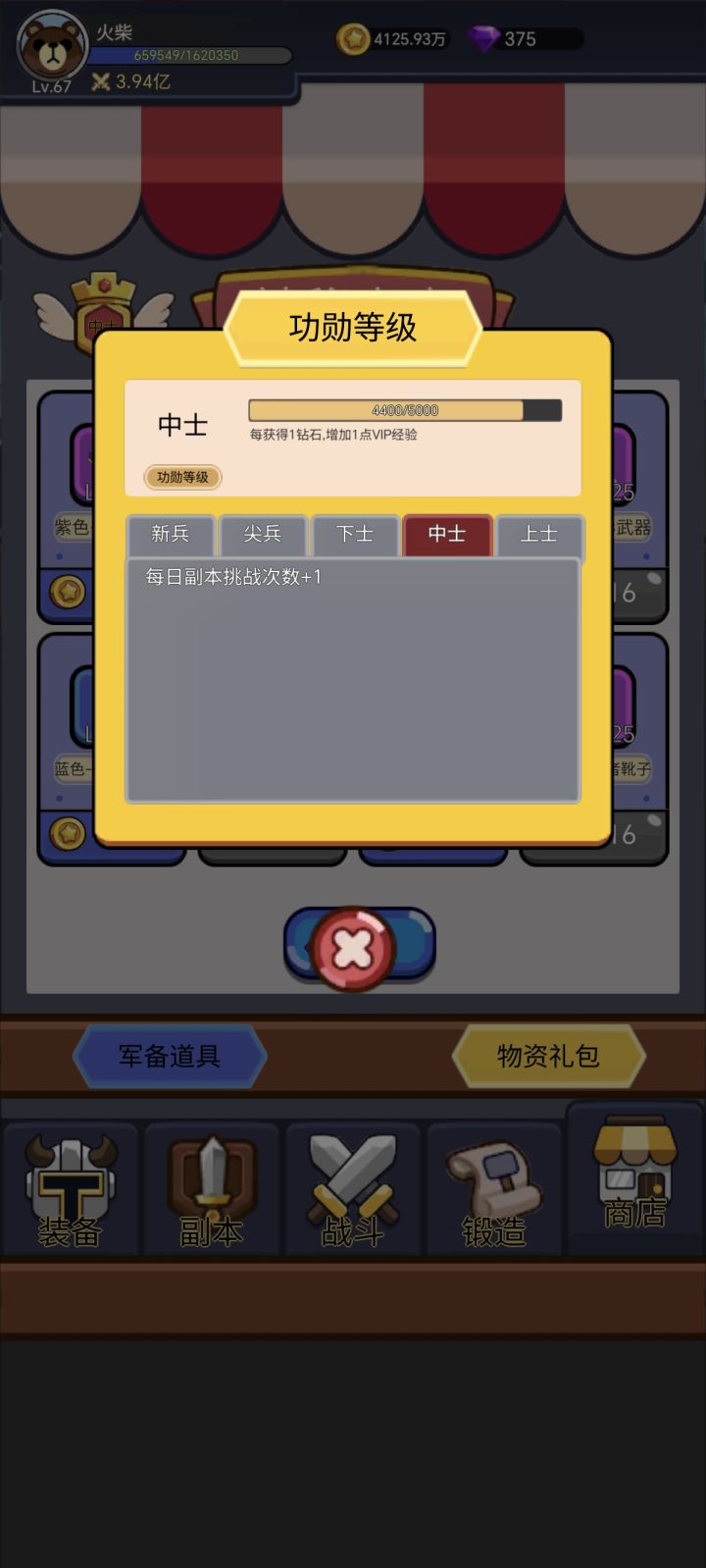 新进游戏的一点感受 新区进入游戏开局战斗打开2倍速 ,商店功勋等级达到少尉,可以开3倍速,进群534838072,可以私聊福利小助手有进群福利码,钻石可以适当买点技能书,前期技能点全给治疗药水,中后期技能可以全学斩击,橙色装备刷出等级战力高的就穿哪个,也可以凑一套套装效果,前期不用太在意要不要凑套装,中后期吸血套应该不错,剩下就是挂机推关,关卡越高获得的装备等级和锻造等级越高,其他玩法有待作者进