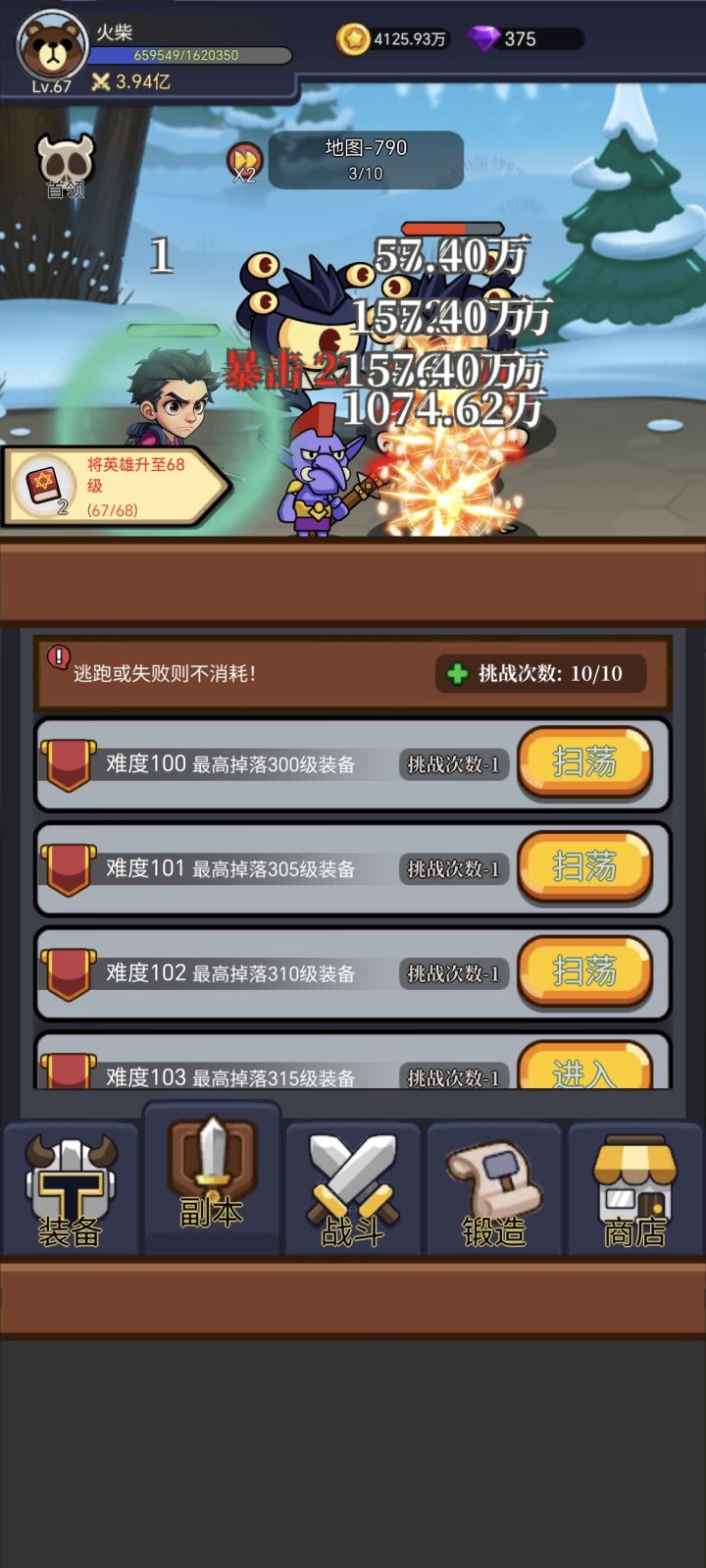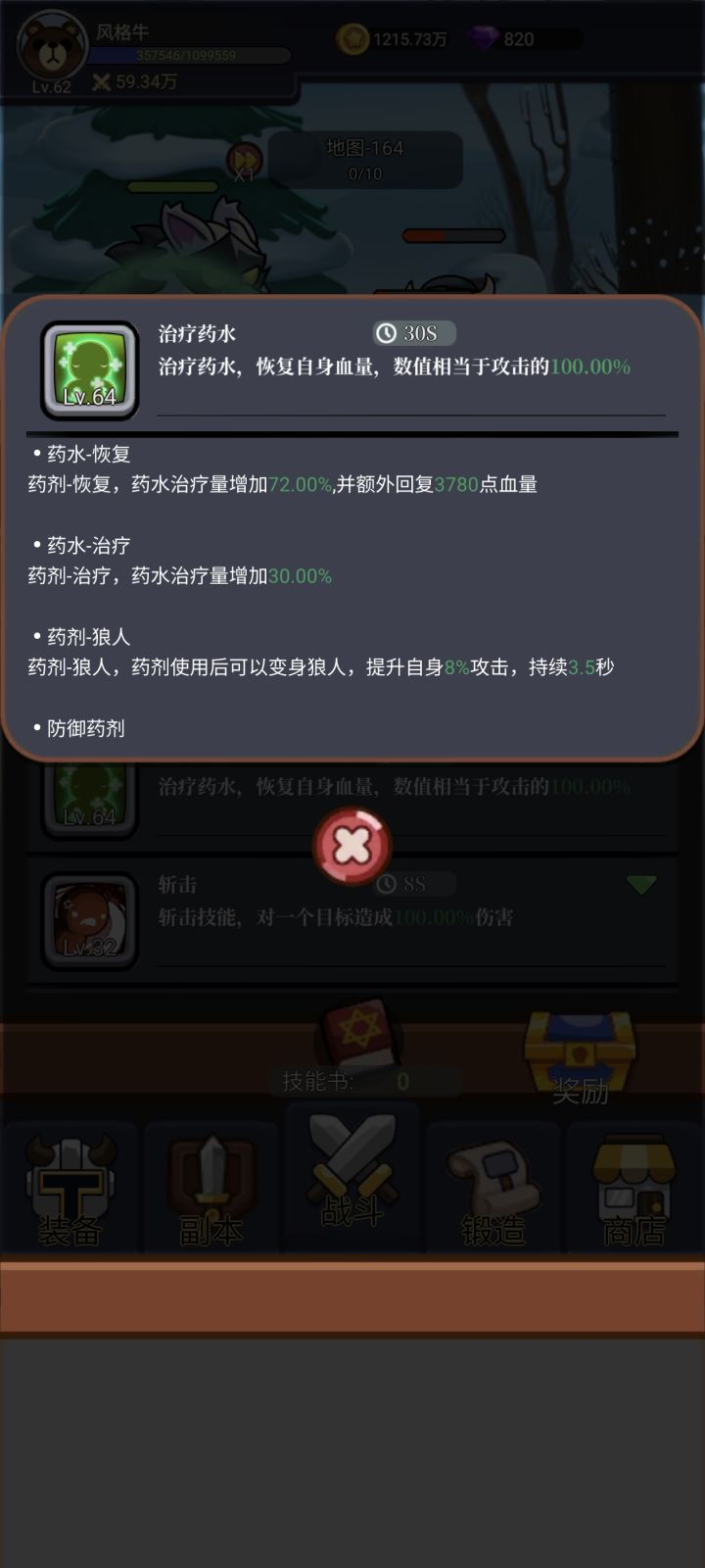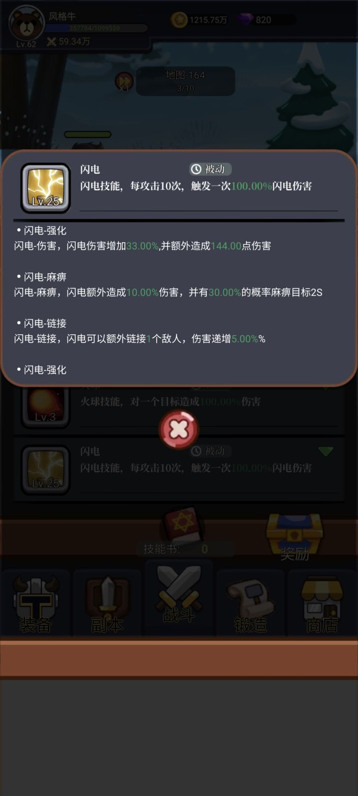 开局:⒈进游戏优先打2倍速,可以提高挂机效率(氪金最高三倍速)。⒉锻造装备,锻造装备等级随着推图的提高而提高,基本上是25层提升5级。优先打造:徽章,披风,裤子,头盔。⒊学技能,目前等级上限170级,优先学治疗药水,你会发现这是神技。然后学斩击,也有恢复效果。然后学闪电。具体技能效果我上面已发图,后面更新满级效果。⒋装备副本,这个按我说的基本没啥用,副本前期都是低阶装备,可以刷一下拿熔炼值
