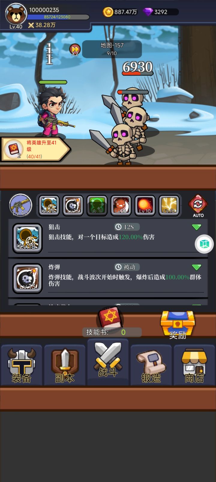 开局:⒈进游戏优先打2倍速,可以提高挂机效率(氪金最高三倍速)。⒉锻造装备,锻造装备等级随着推图的提高而提高,基本上是25层提升5级。优先打造:徽章,披风,裤子,头盔。⒊学技能,目前等级上限170级,优先学治疗药水,你会发现这是神技。然后学斩击,也有恢复效果。然后学闪电。具体技能效果我上面已发图,后面更新满级效果。⒋装备副本,这个按我说的基本没啥用,副本前期都是低阶装备,可以刷一下拿熔炼值