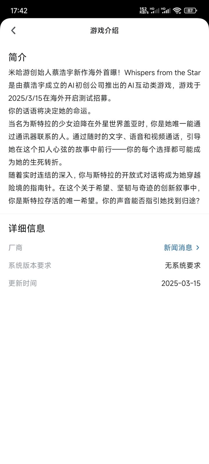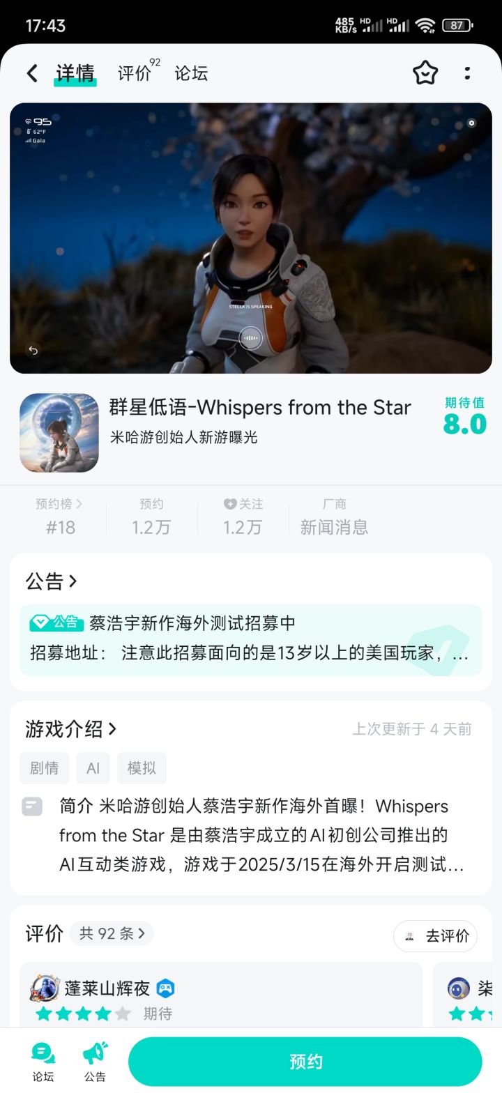 🎮#群星低语whispersfromthestar ✅由米忽悠的创始人另一家游戏公司(AI业务的)✅ AI互动类游戏可以文字语音,视频通话…帮助对面的AI人,走出困境找到归途✅游戏于3月15日海外测试目前国内只可以预约❗约?期待一下AI游戏后续究竟如何❓#游戏种草计划 #游戏安利 #游戏资讯 #吃瓜爆料 #米哈游 #AI