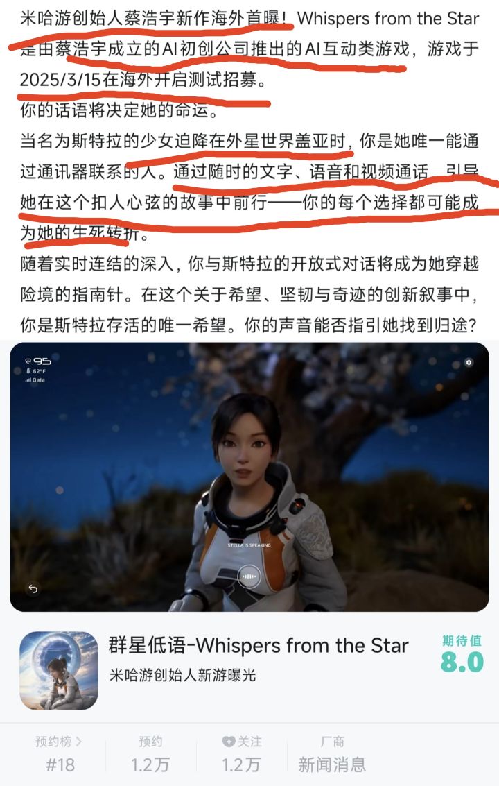 💕类型:剧情、AI、模拟💕米哈游创始人蔡浩宇新作海外首曝!Whispers from thestar 是由蔡浩宇成立的 Al初创公司推出的AI互动类游戏~💕当名为斯特拉的少女迫降在外星世界盖亚时,你是她唯一能通过通讯器联系的人。通过随时的文字、语音和视频通话,引导她在这个扣人心弦的故事中前行一你的话语将决定她的命运~💕感兴趣的宝子可以点击下方❗️预约游戏❗️即可第一时间收到后续信息通知哦❗️
