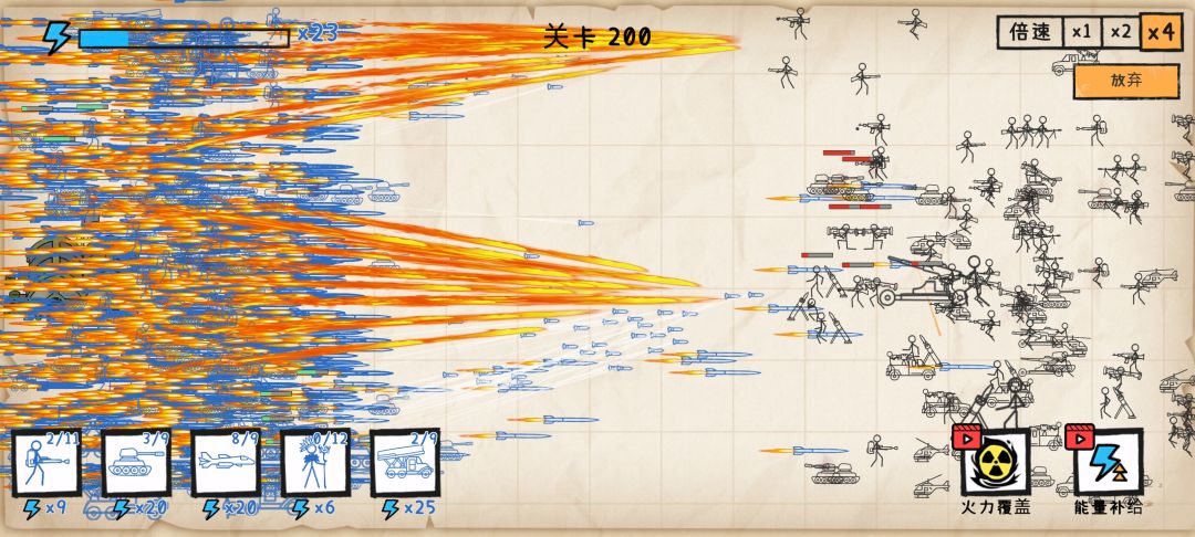 如图,喷火,坦克,飞机,法师(加伤害),火箭弹。这个阵容打300关我觉得都没问题,但是后面太卡了不想打。思路如下: 1.前期只点飞机,以不变应万变; 2.在有4组左右的飞机后,点一组法师,剩下全点坦克和喷火,飞机少了就点一下飞机; 3.在52关时会突然变难,熬过这关就没问题了。此时需要保持喷火兵和飞机的数量; 4.后面只用一直补充飞机坦克,并且造火箭弹。保证喷火在3个左右,坦克飞机5个以上,法师1