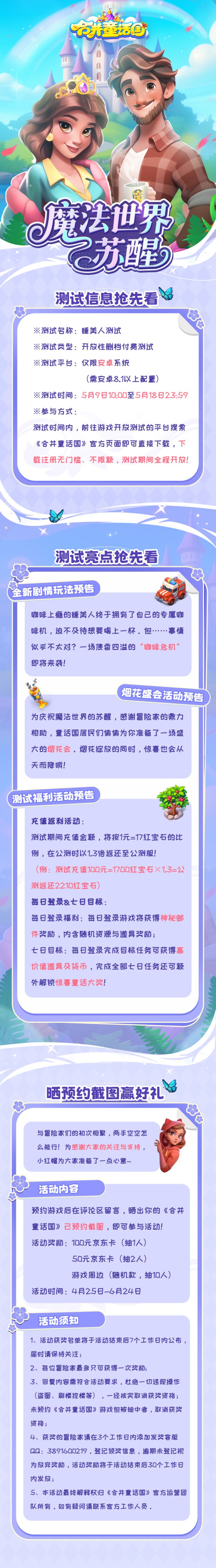 有人喝咖啡喝到失眠有人赶进度赶到秃头但请相信,一切的努力终有回报~ 这不,童话的信鸽传来了惊喜的讯息小红帽赶紧来给大伙报信啦~《合并童话国》「睡美人」测试定档!将于5月9日10:00欢乐开启ヾ(≧▽≦*)o还有全新玩法、限定活动等抢先爆料话不多说,一起先睹为快吧~ 除此之外,小红帽还听说制作团队正在偷偷憋大招放话要给冒险家们带来一次「零压力 」的合并体验!5月9日10:00