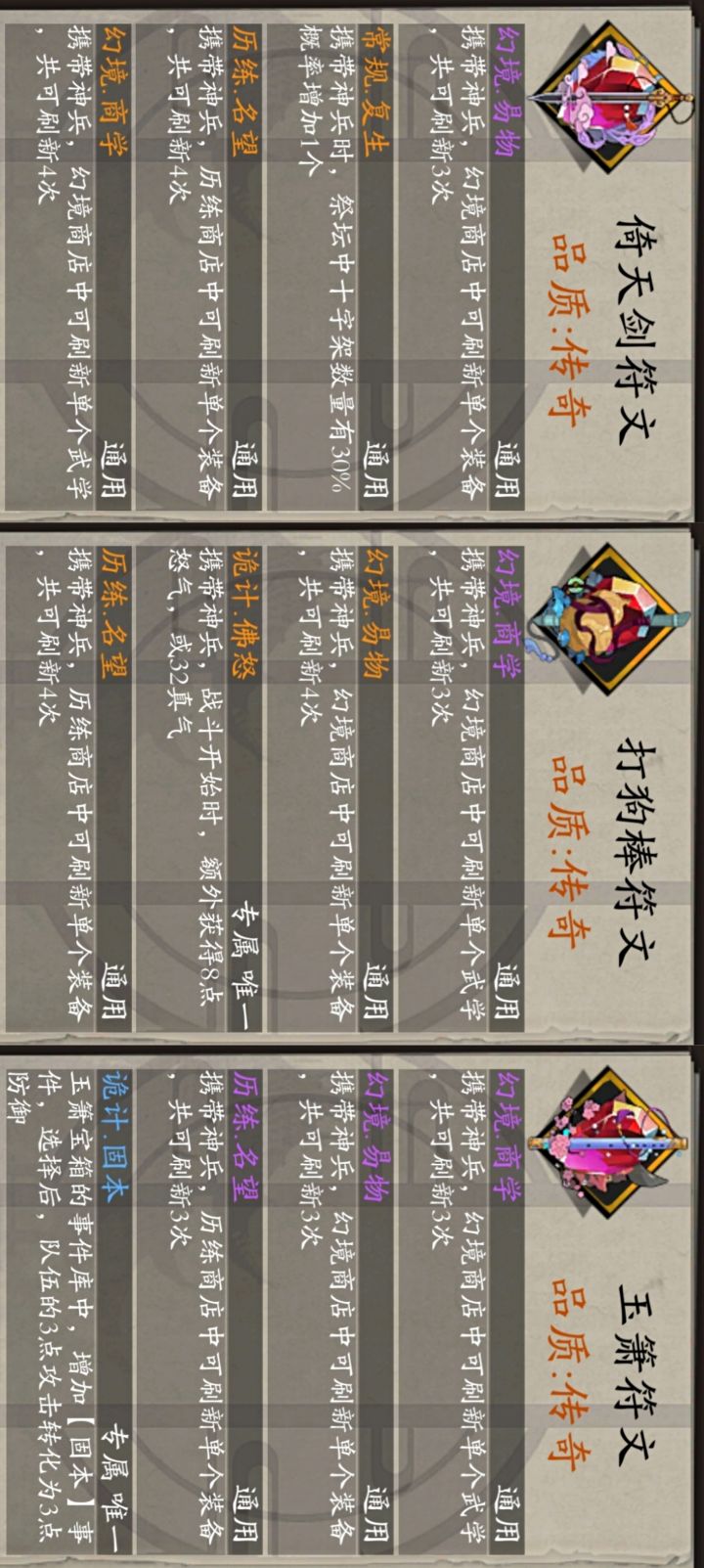 少侠们大家中午好,本喵又来啦~这几天看到少侠们的评论,本喵只想说:别催了别催了,我们技术小哥的头发已经所剩无几了,在做了在做了(0%)但是少侠们不用担心,这次真的不咕咕咕咕啦!所以现在就先跟着糖喵一起来看看新神兵符文吧~新神兵符文——霸王枪符文诡计.刚烈携带神兵,回合开始时,随机使3张手牌获得【移除】和【疯狂1】效果。笑傲.枪意携带神兵,战斗开始时,发现1张附带【疯狂1】效果的【回