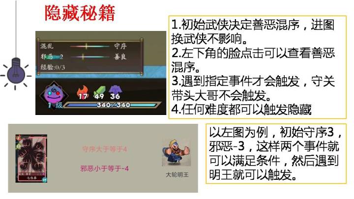 善良3,混乱守序合起来有在-1到1即可混乱-3,善良邪恶-1~1即可混乱守序-1~1,邪恶-3即可这个没什么好推荐的。大部分人打大漠的时候都直接出来了。令人怀疑这是不是个隐藏。查看事件的apphttps://www.taptap.com/topic/5661564【糖喵出品】隐藏秘籍最全攻略:https://www.taptap.com/topic/7944972