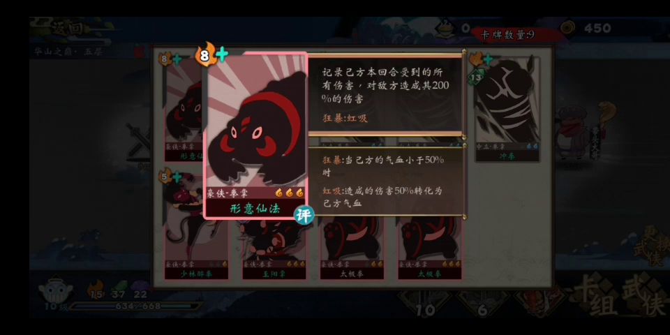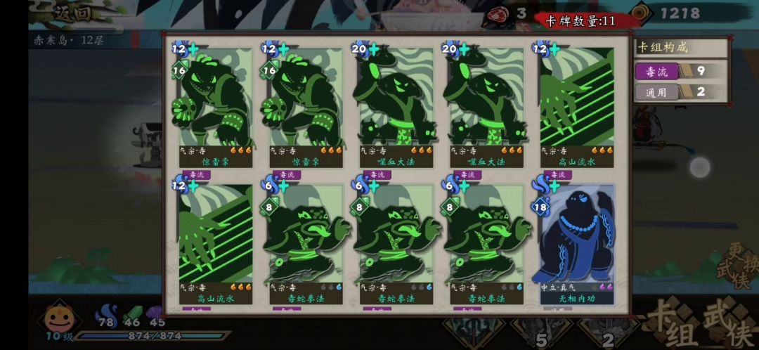 我是无化形,然后4暗冲拳,1断无剑,1阳春,2降龙掌,1蛤蟆功,1焚心神功,打职业历练和符文的,也有可能不用降龙掌换2张八卦掌,看情况,英雄是乔峰,虚竹,欧阳锋
