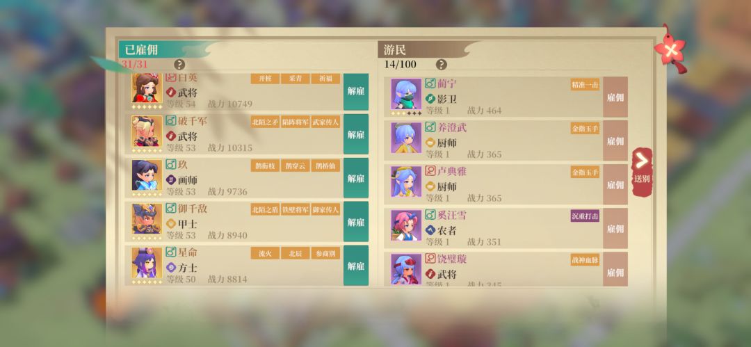 主力5人或者4人+城主 铁匠 裁缝 工匠 各3个 厨师1个 主力是橙色,另外2个用紫色,或者蓝色的升星也行,差别不大; 农民橙色需要培养起来,他采集范围更大。采集升级非常快,可以等他等级起来了传功给主力,然后重新升级。 现在铜钱用不完,需要大量炼丹师,炼丹师不用升级,8级带个丹药加成就行;金色最佳,不用升星。目前2金4紫,紫和蓝差别也不大。6个还是有些不太够 其余的就是各种乱七八糟的搬运工,没有培