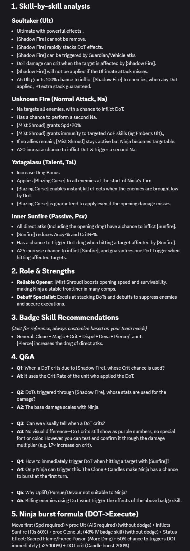 看到外网大佬的帖子,忍者据说相当强力 以下机翻 1. 技能分析 灵魂收割者(大招) - 极致且效果强大。 - [暗影火焰]无法移除。 - [暗影火焰]可迅速叠加持续伤害效果。 - [暗影火焰]可由守护者/载具攻击触发 - 当目标受到[暗影火焰]影响时,DoT伤害可以暴击。 - 如果终极攻击未命中,则不会施加[暗影火焰]。 - A5 Ult有100%的几率对敌人施加[暗影火焰],当施加
