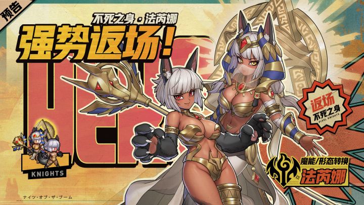 不死之身法芮娜,强势返场!☀️ 活动时间:4月2日~4月15日阵营:降临英雄定位:魔能/形态转换☀️ 法芮娜的“法老形态”拥有治愈和净化的能力、“木乃伊形态”则拥有强大的魔法天赋,能造成迷离和禁疗的减益效果,战斗中首次受到致命伤害还将触发“永生主宰”,可以复活所有已阵亡的友方英雄。☀️ 活动内容:● 心愿招募 :活动期间,可选择“不死之身”作为保底英雄,并使用“永生咒环”进行召唤;●