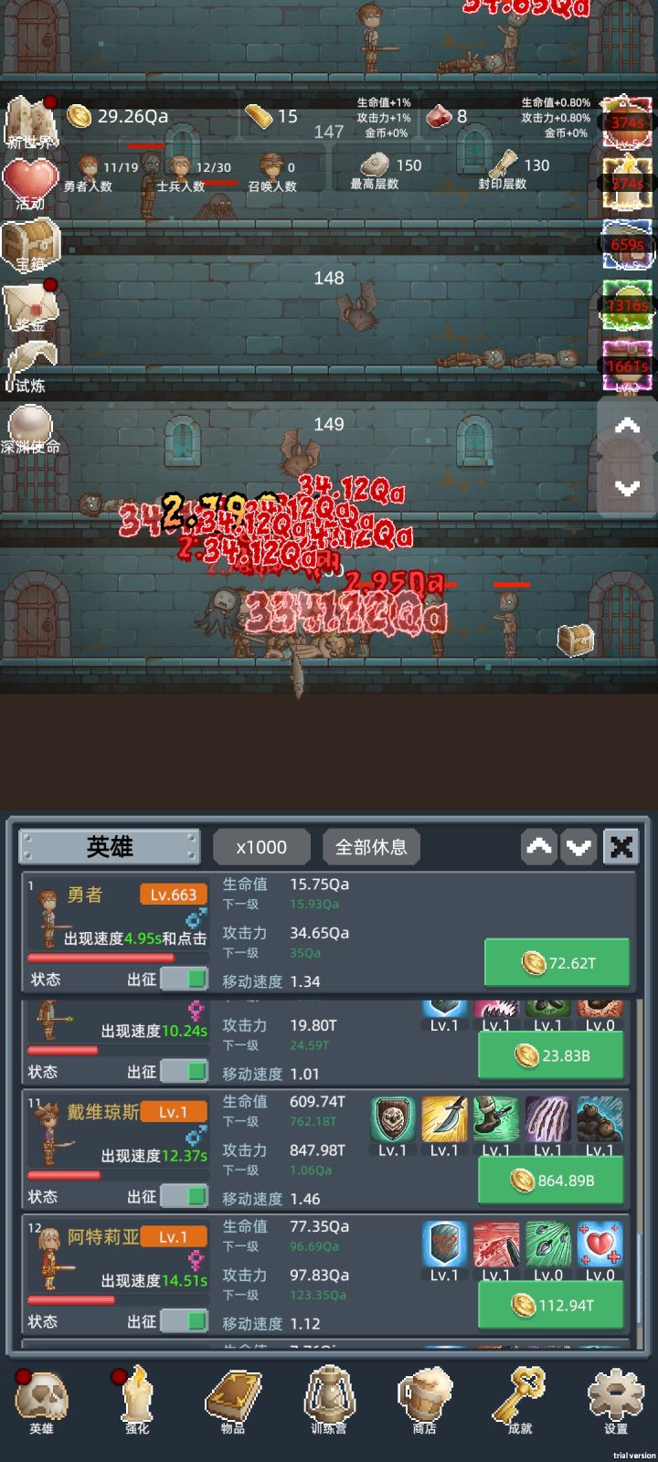 角色养成系统丰富,从基础勇者到特殊英雄(如戴维琼斯、阿特莉亚),每个角色都有专属技能与属性偏向,搭配不同天赋树能玩出多样流派。虽然前期数值增长较慢,但随着轮回解锁更多加成,后期战力飙升的成就感十足。