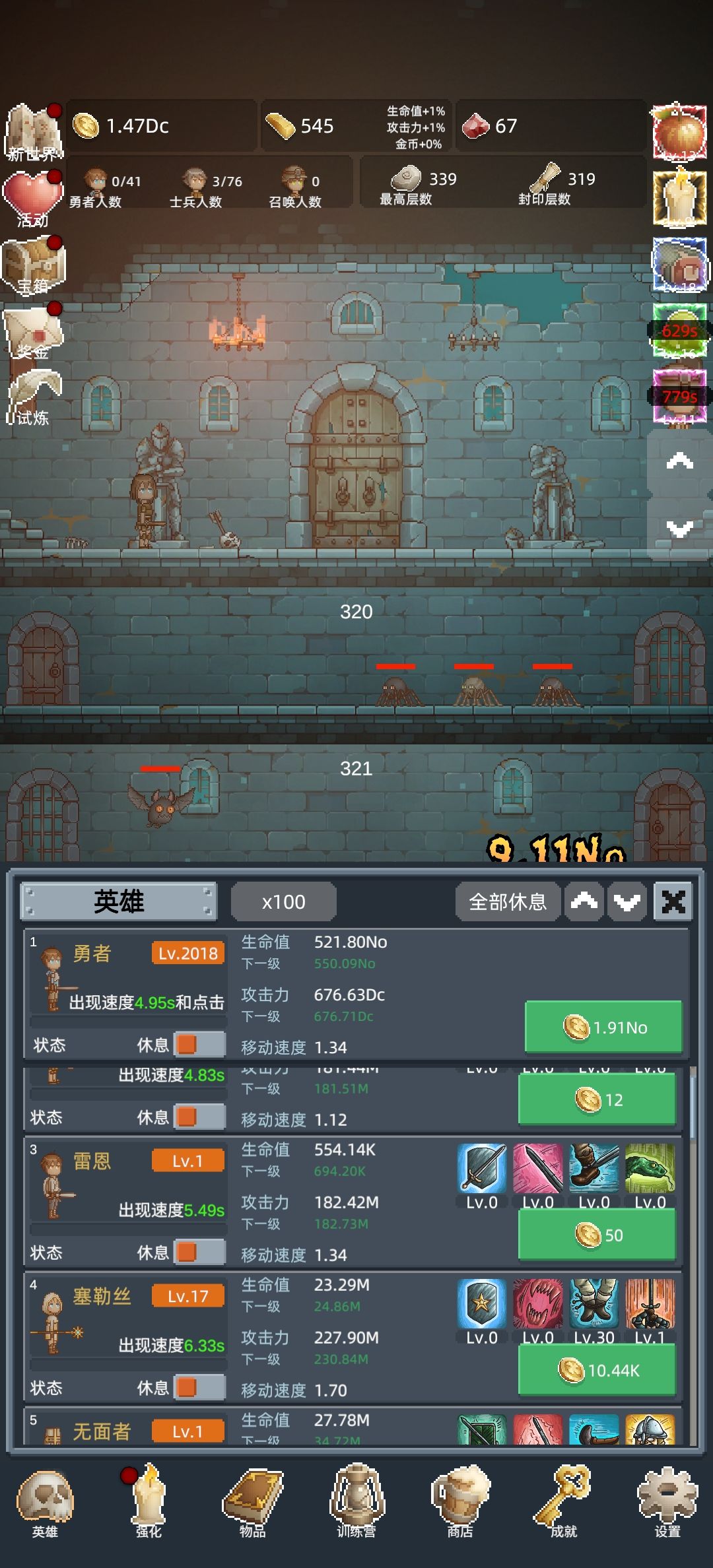 开局先填兑换码,官方帖子有。 在前几次重生前不需要特意升级勇者,开新佣兵推层更快,佣兵可以适当升级,只要升级花费的金币不超过开新佣兵的十分之一就行。 商店加属性的酒买满,其他的不建议用金条买。 最少重生一次并且最低刷到150层之后,之后的每次重生都会开启试炼,在限定的时间内推到目标层数,会有不少奖励。每个10的倍数层都有几率刷出宝箱,前期就是不停的重生试炼刷宝箱,商店的东西除了加属性的酒,其他的每