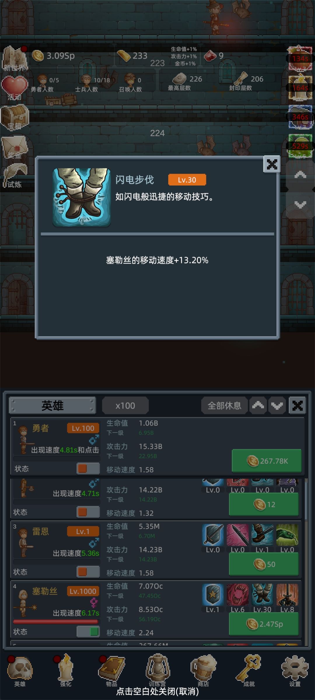 中期就是能快速打到100层以上了,具体多快,五分钟以内。 这时考虑的就是效率。老生常谈,中期不开连点吸血鬼还是不考虑。 一般玩法和萌新建议一样 变数在于有木有开到给金币的头盔以及头盔给的初始金币数量。 到了大约五十k以上就可以换个效率高点的点法,第四个女佣兵。速度没升技能因该是1.67,30速度是1.70。 这时属性把钱点到4号位等级,初始钱全点应该能打到五六十层。 1.34比1.67速度计算十层