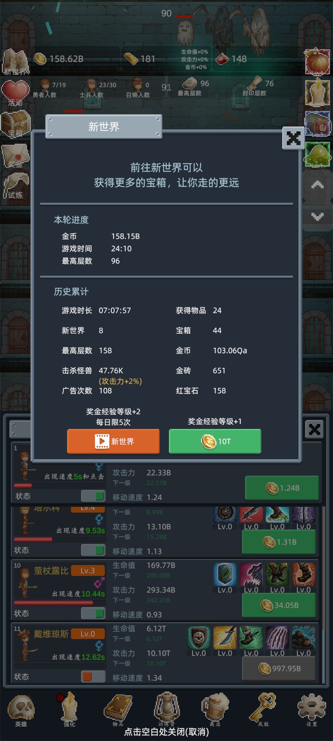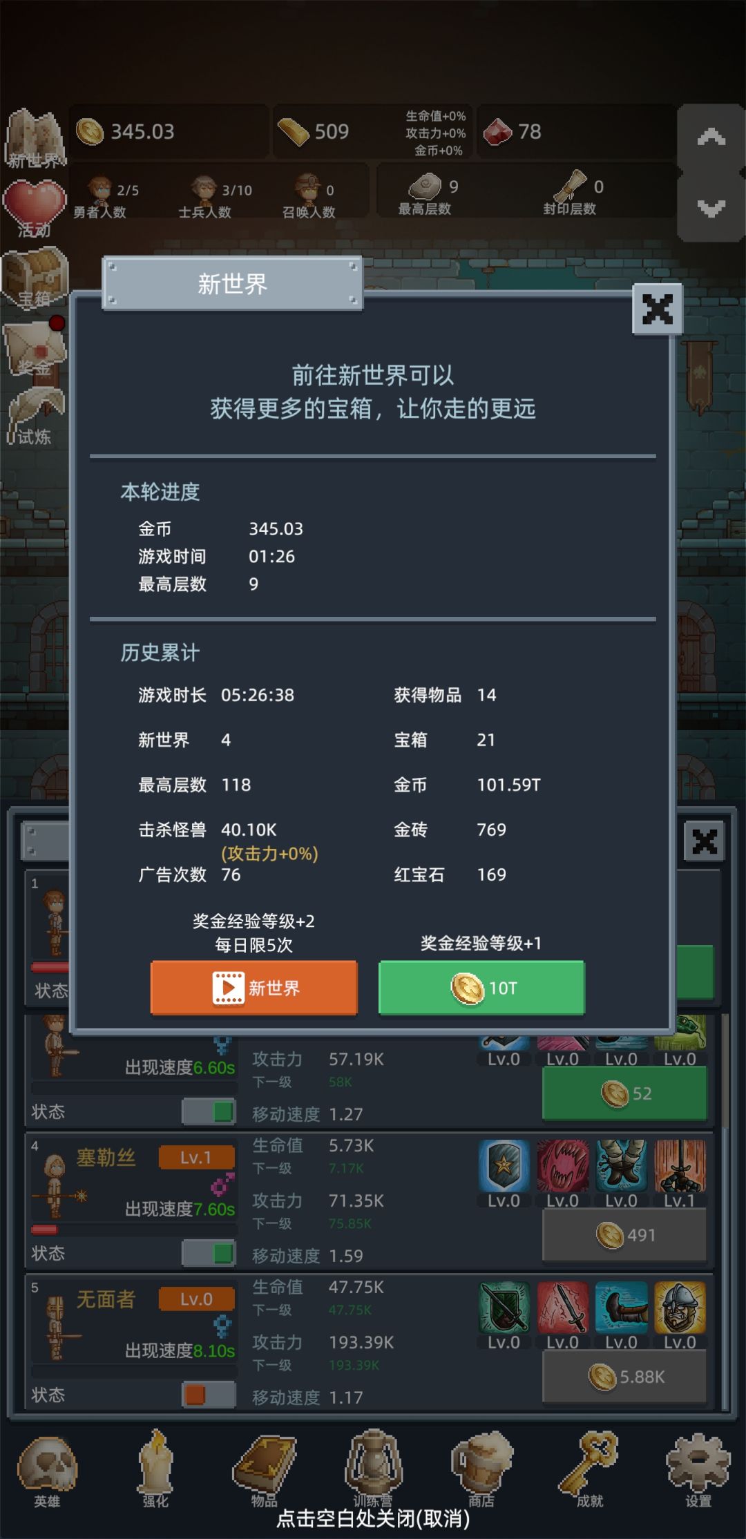 这游戏好玩的,一口气玩了好久,简单分享一下自己的想法。左上角信封的广告奖励尽量拿完,每次进新世界可以在商店升级5次勇者之赐,加属性的,需要用金砖。金砖用来升勇者之赐就行。金币的花费我是除了开新士兵之外,主要升级勇者。点出强化里的战阵结晶之后,勇者能高频率召唤,主要推层就靠他了。另外,左上角活动里有每日奖励和tap签到跳转按钮,记得领哦。