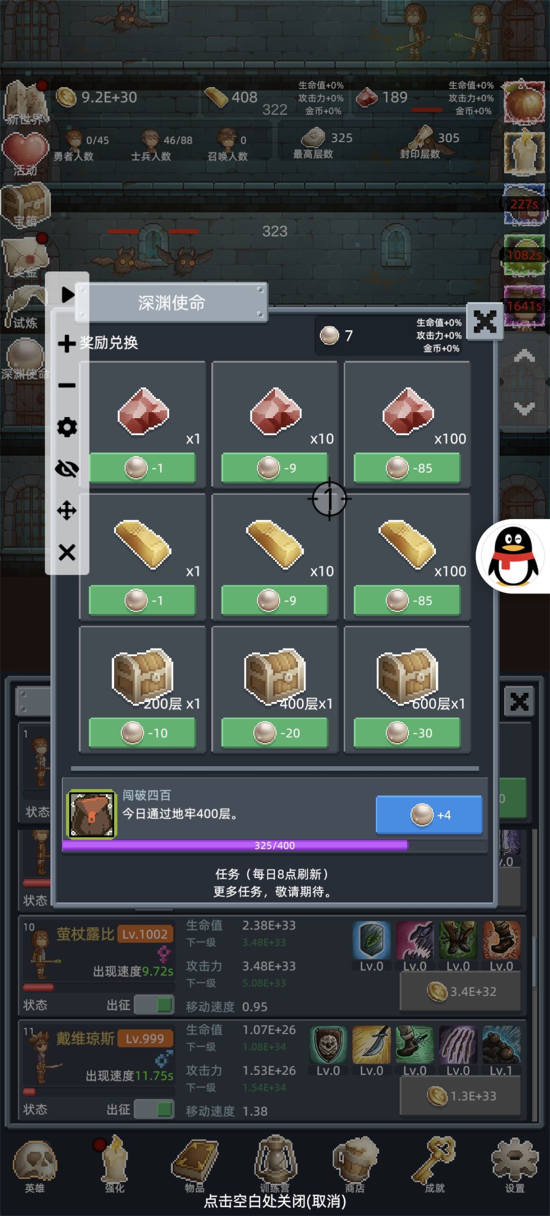 开局先填兑换码,官方帖子有。 在前几次重生前不需要特意升级勇者,开新佣兵推层更快,佣兵可以适当升级,只要升级花费的金币不超过开新佣兵的十分之一就行。 商店加属性的酒买满,其他的不建议用金条买。 最少重生一次并且最低刷到150层之后,之后的每次重生都会开启试炼,在限定的时间内推到目标层数,会有不少奖励。每个10的倍数层都有几率刷出宝箱,前期就是不停的重生试炼刷宝箱,商店的东西除了加属性的酒,其他的每