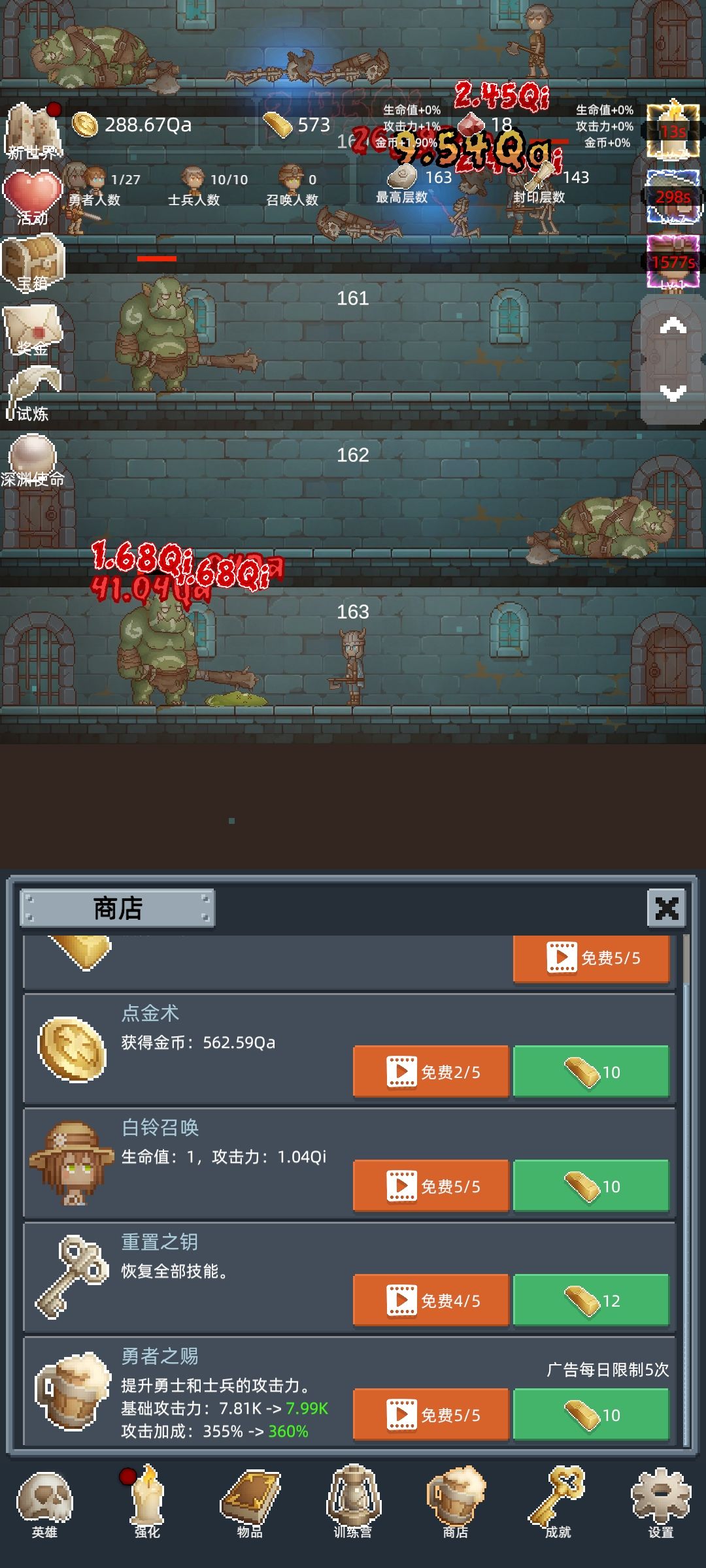 游戏核心资源:金砖和金币。 1、金砖通过兑换码,联系客服反馈bug获得 2、金币通过击杀怪物获得 金砖分配,只用在勇者恩赐加群体百分比攻击。 金币分配,针对新玩家前3轮转生不建议升级士兵,只用做【开士兵和升级勇者人口和士兵人口】。打不过去就【升级勇者】,勇者等级上去后【升结晶与魔晶】。 前3轮转生均在105关左右,开997B士兵后囤金币10T转生用。 请各位玩家重点注意,游戏的商店机制