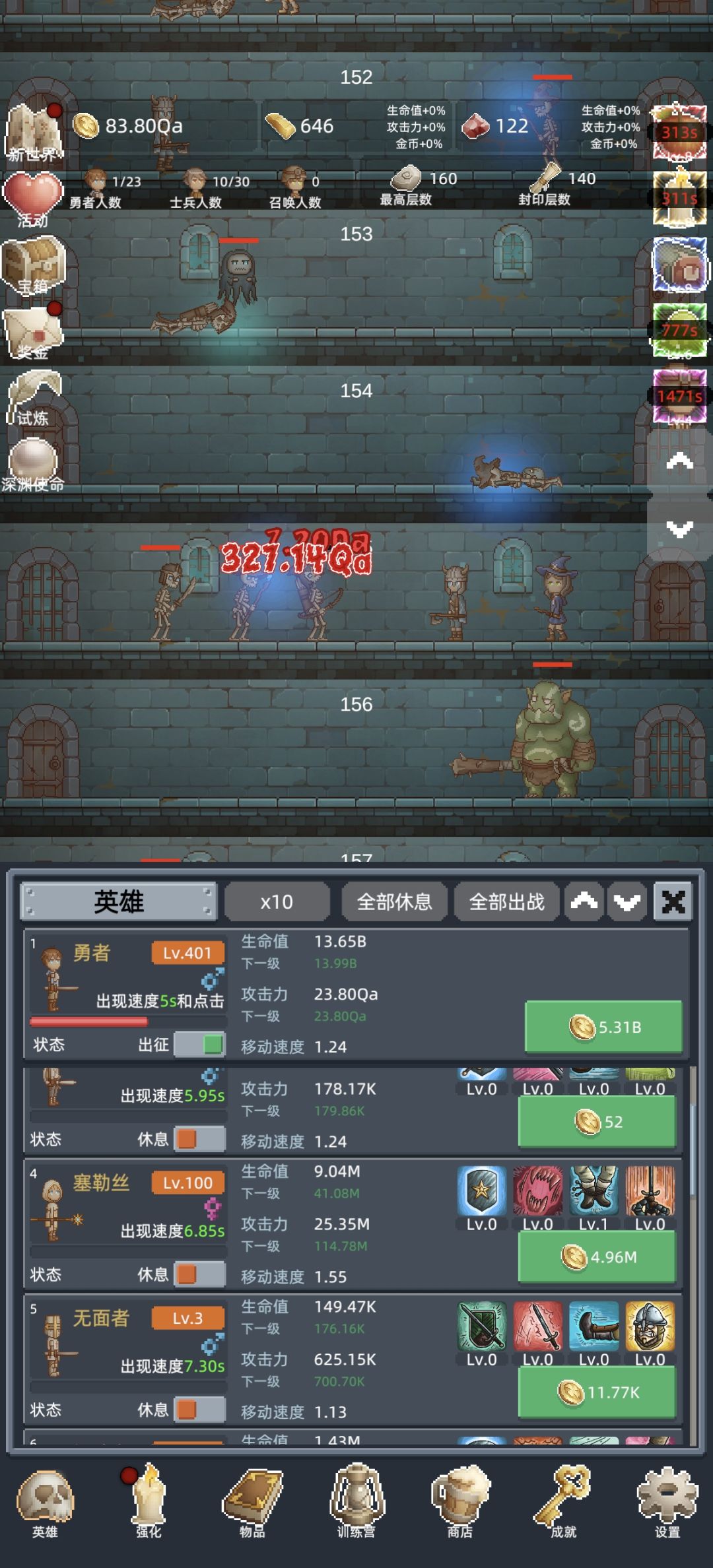 开门见山!游戏核心目标是推关。 推关我遇到的误区: 1.不是木剑等加攻击力的物品级别越高推关越远。 ps:因为这是个倍数游戏,前期通过高攻击力,跳过了本应购买相应层数的佣兵。但随着层数提高,不购买对应层数的佣兵推关举步维艰。(很难通过高攻击力跳过一个区间的层数,外500层后更明显。) 2.开箱子充阳寿双倍的时机不对。 ps:不要在推关过程中开双倍箱子,虽然推关过程中会出现新东西,但更多的是木剑,技