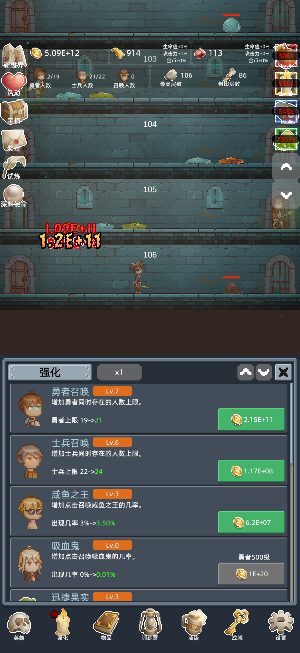 核心原则:拒绝熬关,短平快转生 新手最容易踩的坑就是死磕关卡,其实游戏核心玩法是“转生叠buff”:每轮转生控制在30-55分钟,比硬磨105关效率高10倍 。前3转不用追求高层数,100-105关攒够10T金币就直接转生,重点拿“勇者恩赐”的永久属性加成,越转战力越猛。 资源分配铁律 - 金砖:只买“勇者恩赐”!每次转生必把商店5次每日+5次重开刷新的恩赐全买完,群体百分比攻击加成是