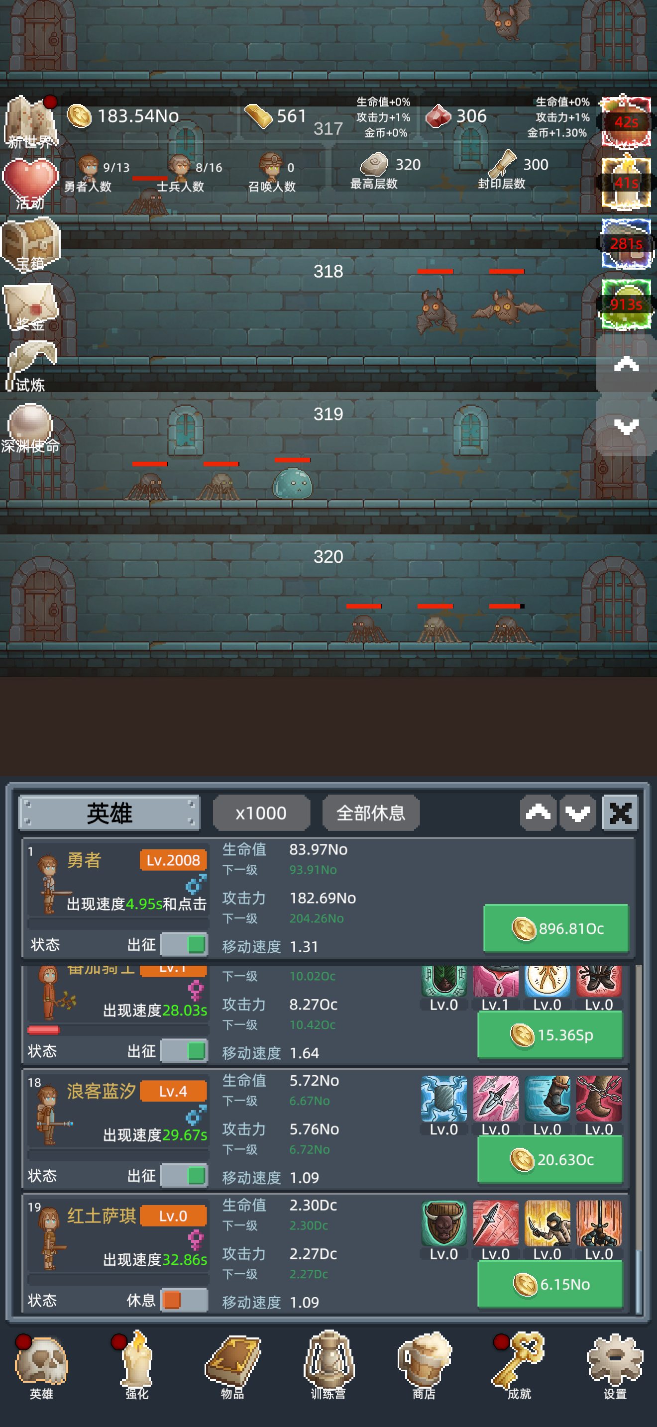 如果卡关了,想冲一下高层的话有三个小技巧。 第一个就是利用时间去堆,不过不要,直接挂机,挂机太慢了,你可以挂个小窗而且可以把游戏重复退出,再进入刷一下宝箱怪。 第二个就是如果玩到后期的话,有些。英雄是升到1000级以后,战力有质的变化的,可以尝试把那些英雄升到1000级。或者等到。能升到2000级的时候,它也会产生质变。 第三个就比较慢了,如果要到高层的话,可能需要自己不断重生,把一些物品的