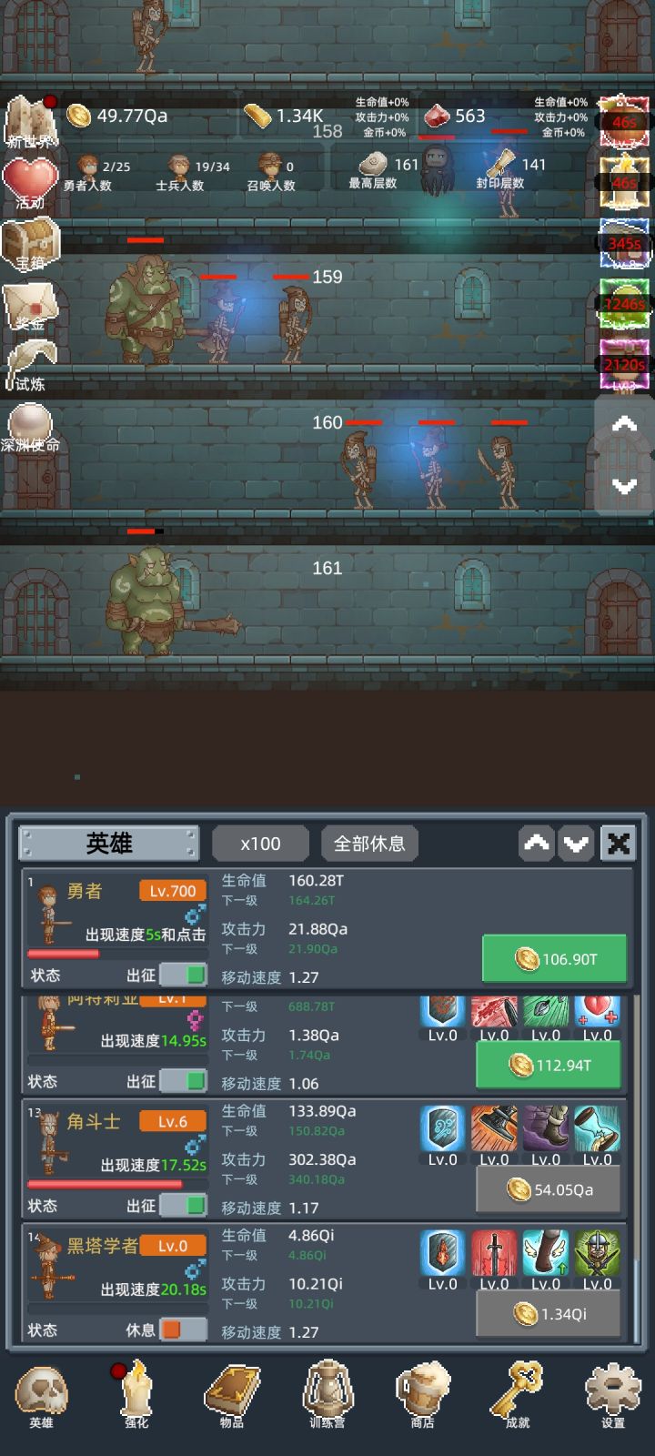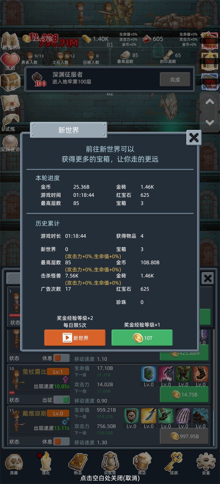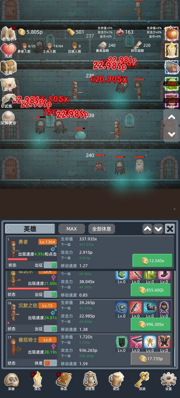 开局进群把兑换码用完, 商店:商店的东西只能买5次,每次开新世界重置 在商店买【勇者之赐】,升级勇者,点击出兵。 在商店买【点金术】,同样只能买5次,建议在第10个士兵【营仗露比】16B,【点金术】给10B-16B的时候买一次。 【点金术】500B的时候,买两次升11士兵【戴维琼斯】。 【点金术】5T的时候,买两次,然后直接开新世界。 士兵每个只用升到4级,就够用了。