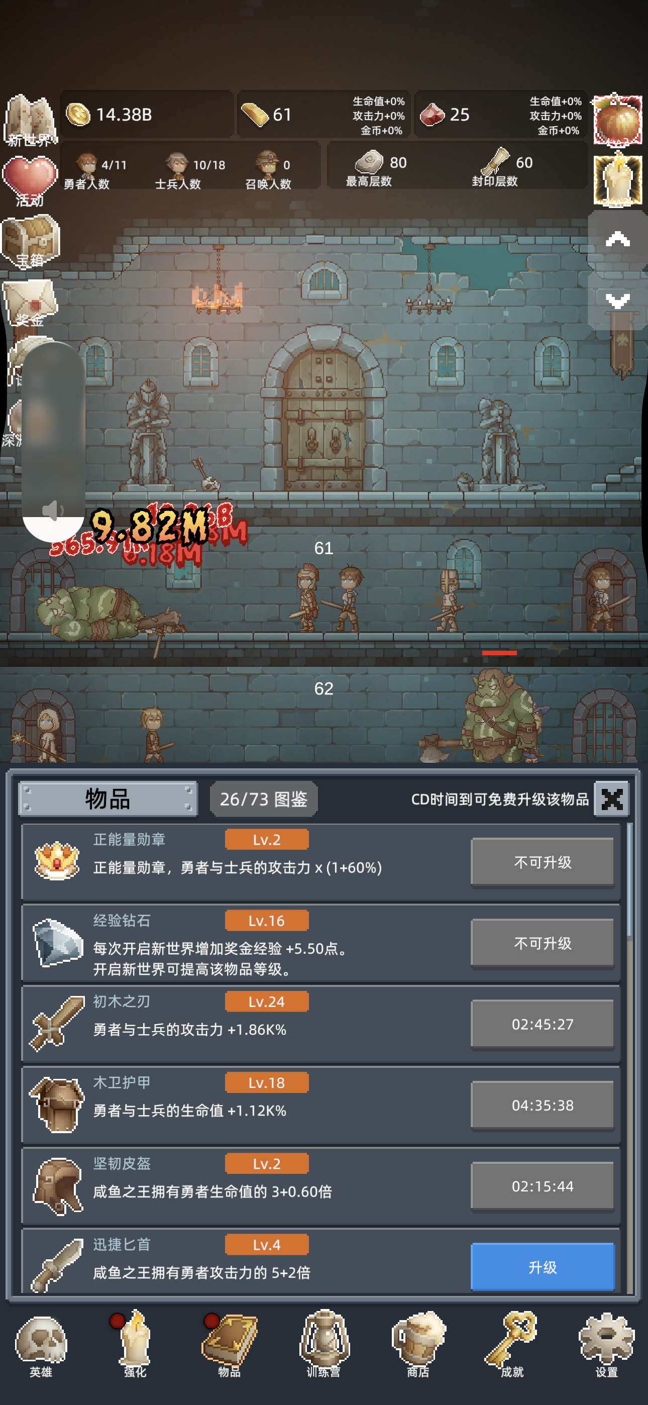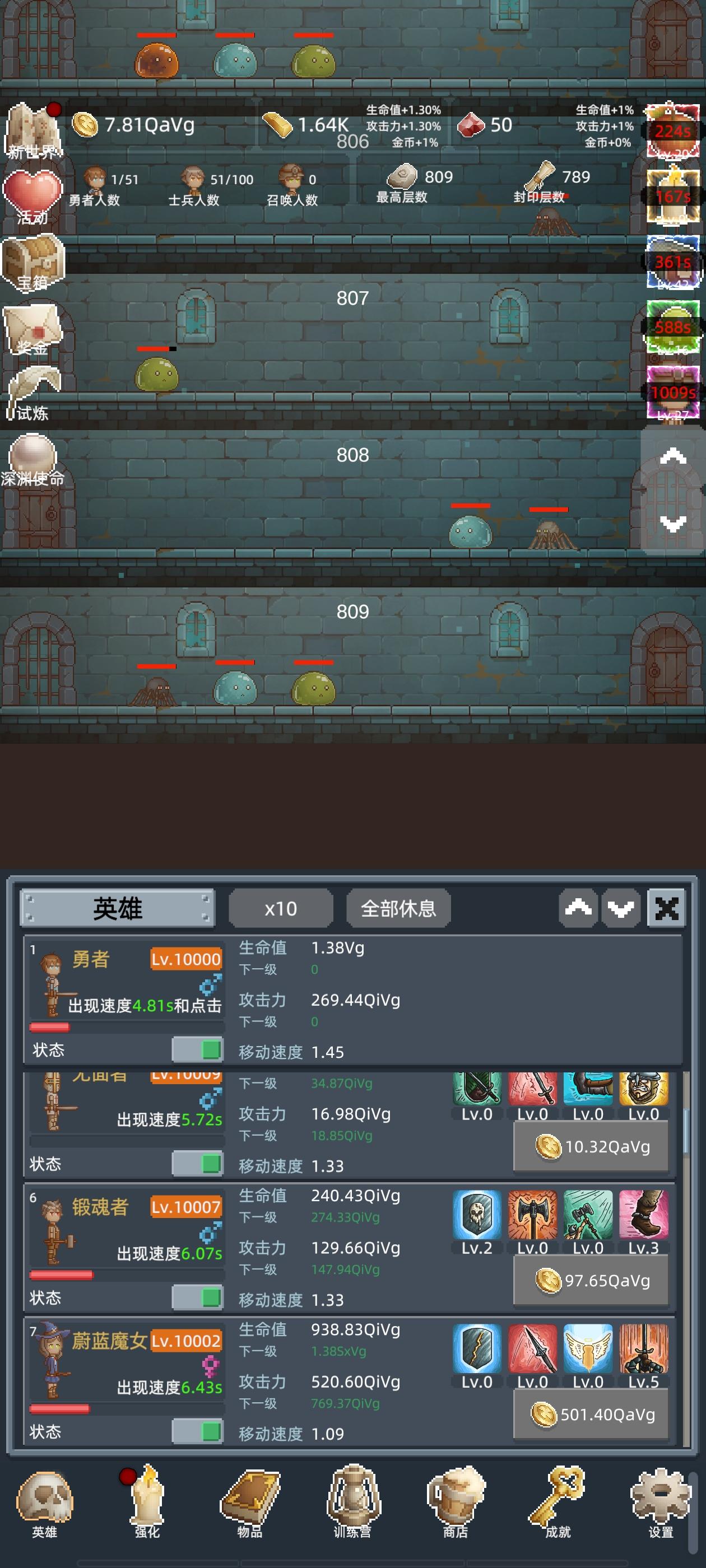 这里是冲最高层的一些小技巧,在你拥有增加刷宝箱怪的几率的物品时(以及大概是5%),比如你卡在600层,这时候你可以退游戏再进,刷宝箱怪,大概能刷到596层或597的宝箱怪是最好的,方便打有技能就开,你能通过宝箱怪获得大量金币,这时候你就不需要花时间去刷那些小怪,你获取金币的效率会高很多,目前我的一个宝箱怪金币倍数是146倍再乘上技能的一百倍,大概你刷一个宝箱怪就能获得当前层数收益的一万倍金币,非常
